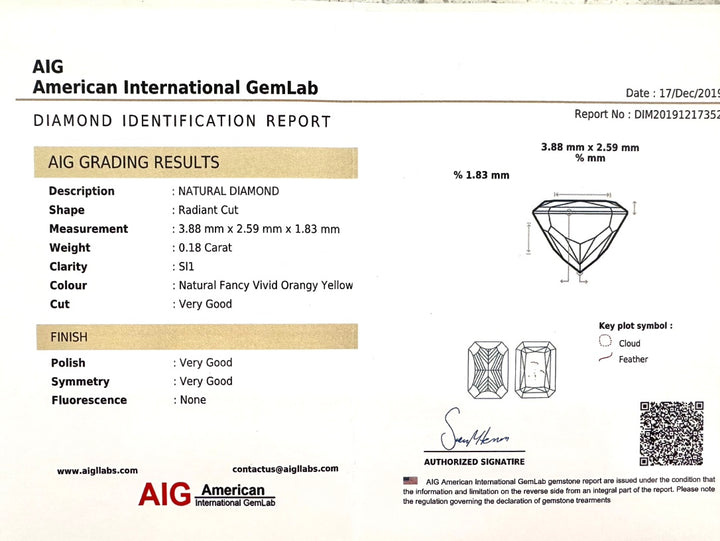Experience the captivating allure of this 0.18ct natural diamond, radiating with a vivid orange yellow hue. With slight/VVSI clarity and a very good cut, this gemstone sparkles with a lively brilliancy that can enrich any jewelry piece. Originating from Africa, this diamond is an exceptional choice for those who appreciate unique and colorful gemstones. Its vibrant color and quality make it an ideal centerpiece for custom designs, offering a burst of color and elegance to any collection.