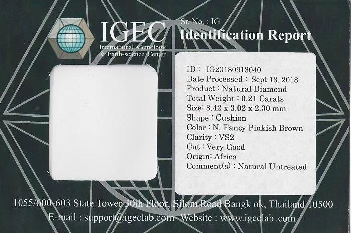 Step into elegance with this 0.21ct natural diamond, radiating a sophisticated fancy pinkish brown hue. The cushion cut enhances its beauty, offering a unique shape that catches the light perfectly. With VS2 clarity, this diamond provides exceptional quality and brilliance, ideal for creating standout jewelry pieces. Sourced from Africa and accompanied by an IGEC certification, this natural and untreated diamond assures authenticity and superior craftsmanship, making it a treasured addition for collectors and designers alike.