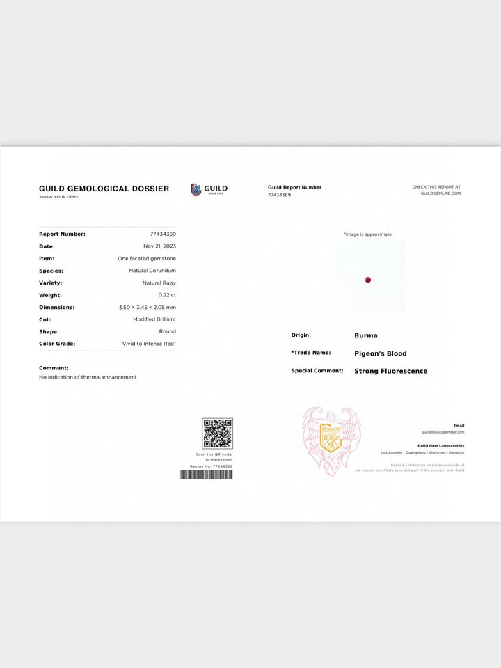 Discover the profound beauty of a 0.42 carat natural ruby, remarkable for its vivid red hue characteristic of the legendary pigeon's blood color. Originating from Burma, this gemstone is notable for its strong fluorescence, enhancing its visual appeal. Free from any thermal enhancement, this ruby maintains its natural purity and brilliance. Cut into a modified brilliant style, it offers an outstanding sparkle, making it an ideal choice for a collector or for crafting an elegant piece of jewelry. This ruby stands as a testament to nature's unadulterated beauty and unparalleled craftsmanship.