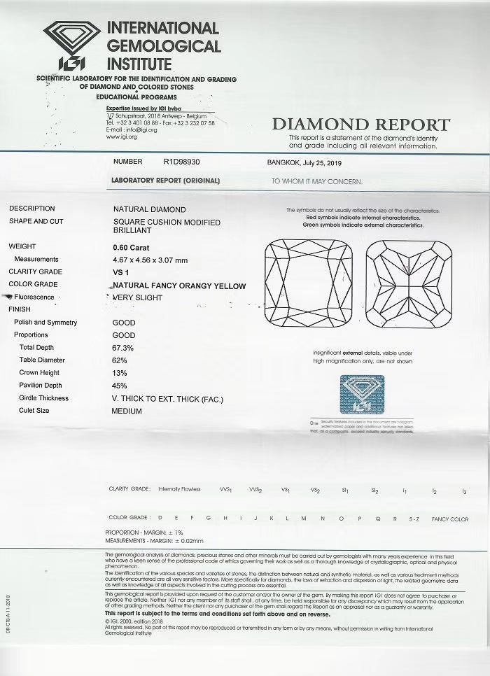 Elevate your jewelry collection with this rare and exquisite Natural Fancy Orange Yellow Diamond, boasting an impressive 0.60 carat weight. This breathtaking gemstone features a Square Cushion Modified Brilliant Cut, known for maximizing brilliance and enhancing the diamond's exquisite color. Measuring 4.67 x 4.56 x 3.07 mm, it showcases a unique blend of vibrant orange and yellow hues, eye-clean clarity, and a superior craftsmanship that captivates the eye. Certified by the International Gemological Institute (IGI), this diamond is more than just a jewel—it's a remarkable treasure for gemstone collectors and jewelry enthusiasts seeking rare beauty.