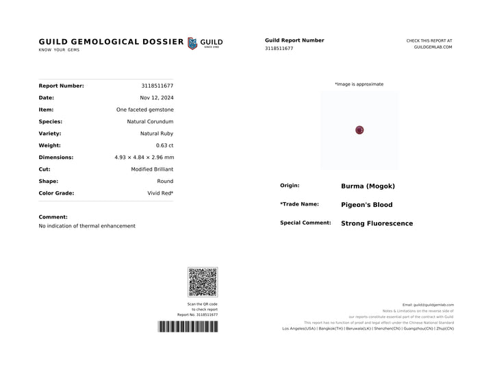 Presenting a breathtaking guild-certified natural ruby, exquisitely unheated and extracted from the renowned mines of Burma (Myanmar). This exceptional 0.63ct gemstone displays the coveted pigeon blood color, a rich and vibrant shade that captivates with its intense beauty. Expertly cut to perfection, this ruby ensures maximum brilliance and sparkle, complemented by its eye-clean clarity that guarantees a flawless appearance. Every facet of this gemstone is a tribute to the finest quality and unparalleled craftsmanship, suitable for the most distinguished jewelry pieces or as a prized collectible asset. Accompanied by a laboratory report (number: Guild-3118511677), this natural corundum variety ruby promises authenticity, affirmed by its unheated state and pristine condition.