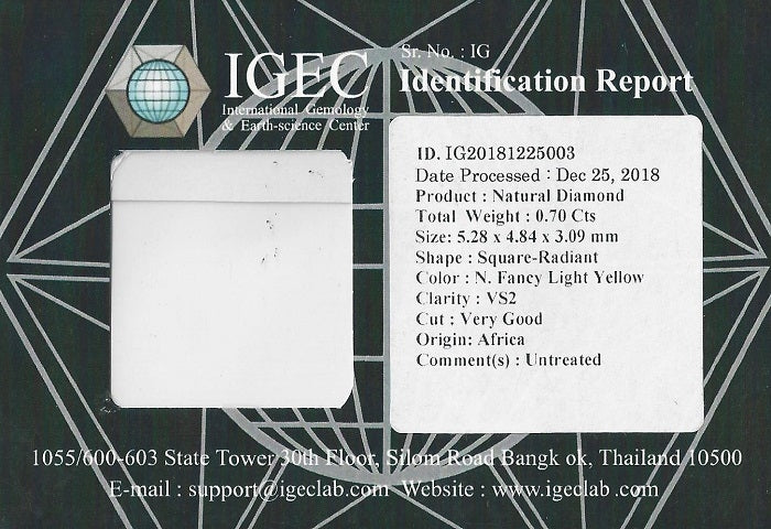 Delight in the subtle elegance of this Natural 0.70 carat Fancy Light Yellow Diamond, beautifully cut in a Square Radiant shape to amplify its inherent brilliance. With its VS2 clarity, this diamond offers a remarkable visual appeal, showcasing only minor inclusions that are invisible to the naked eye. Measuring 5.28 x 4.84 x 3.09 mm, this gem promises an exquisite sparkle and color play. Certified by the IGEC, this untreated gem originates from Africa, a testament to its authentic beauty and heritage. Whether you're looking to enhance your personal collection or find the perfect centerpiece for a bespoke jewelry piece, this diamond delivers both allure and distinction.