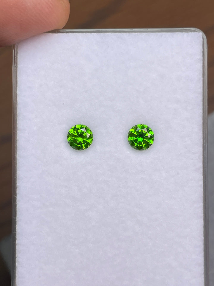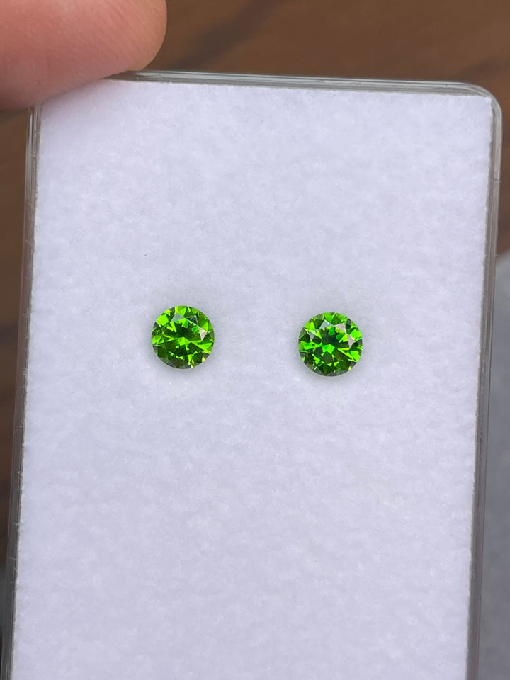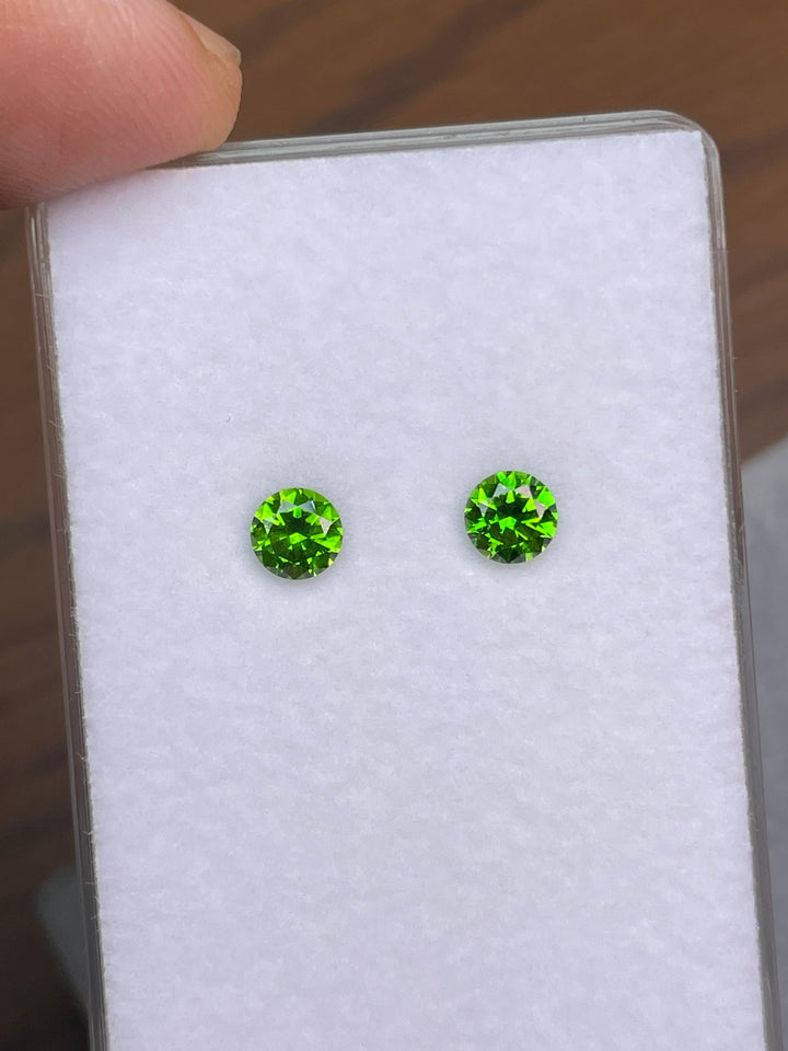 Unveil the exquisite beauty of a 0.93-carat pair of Russian Demantoids, unblemished and displaying a striking vivid green color. These demantoids are 100% clean, showcasing unparalleled clarity and brilliance, making them exceptional choices for jewelry making, particularly earrings or elaborate bespoke designs. With a diameter of 4.8mm, they are ideally sized to create a captivating focal point in any piece. Known for their remarkable dispersion, these vibrant gemstones from Russia are highly sought after by collectors and designers alike. Enhance your collection or design a stunning piece of jewelry that speaks volumes of elegance and luxury.