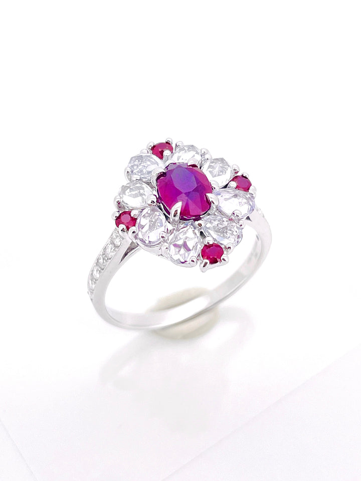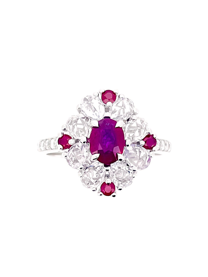 Elevate your jewelry collection with this stunning 14K gold ring, showcasing a 1.01 ct unheated Burma ruby with the highly sought-after pigeon blood red color. The centerpiece ruby is beautifully complemented by 1.66 ct of sparkling white sapphires and 0.15 ct of vibrant additional rubies. Complete with 0.16 ct of diamonds graded G color and VVS clarity, this ring radiates luxury and elegance. Weighing 3.72 grams and available in size 14, this exquisite piece combines classic design with exceptional gemstones, making it perfect for any special occasion or as a cherished addition to any jewelry collection.