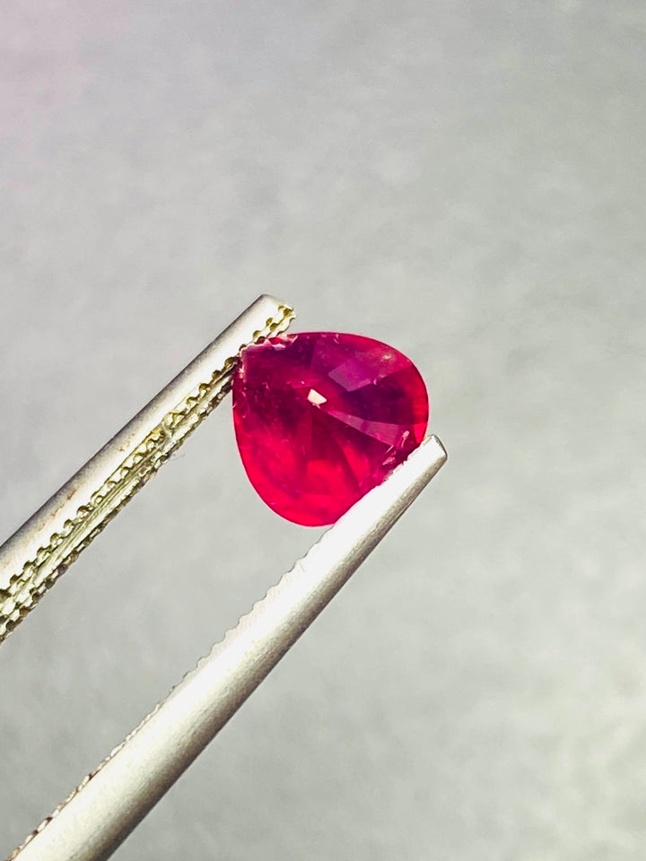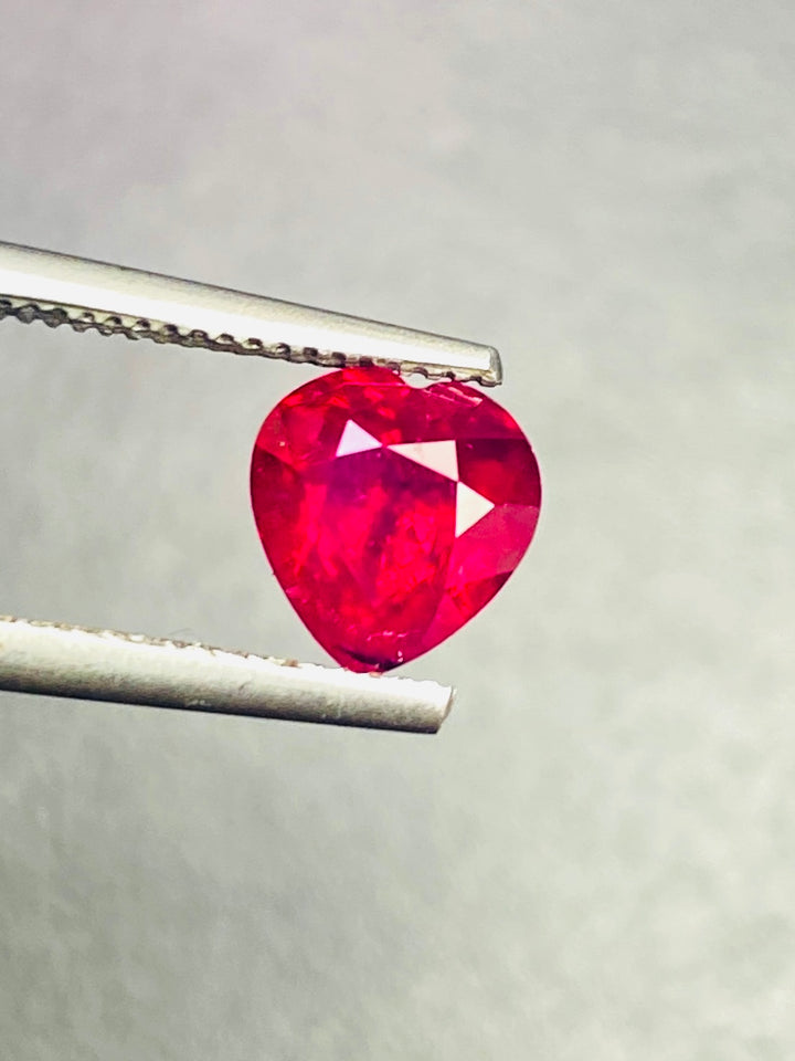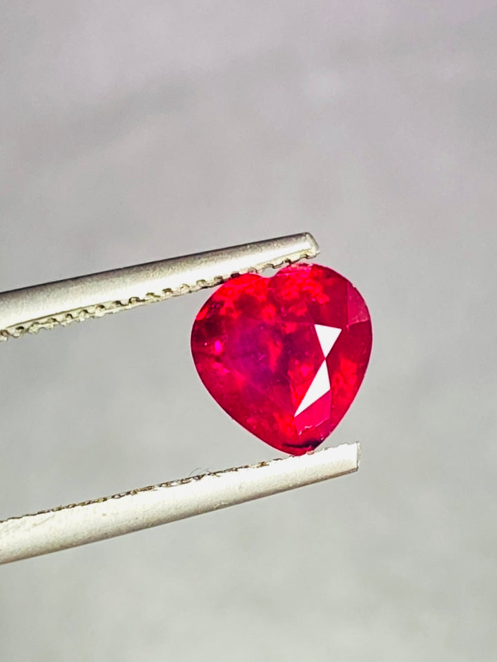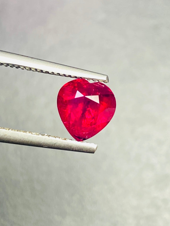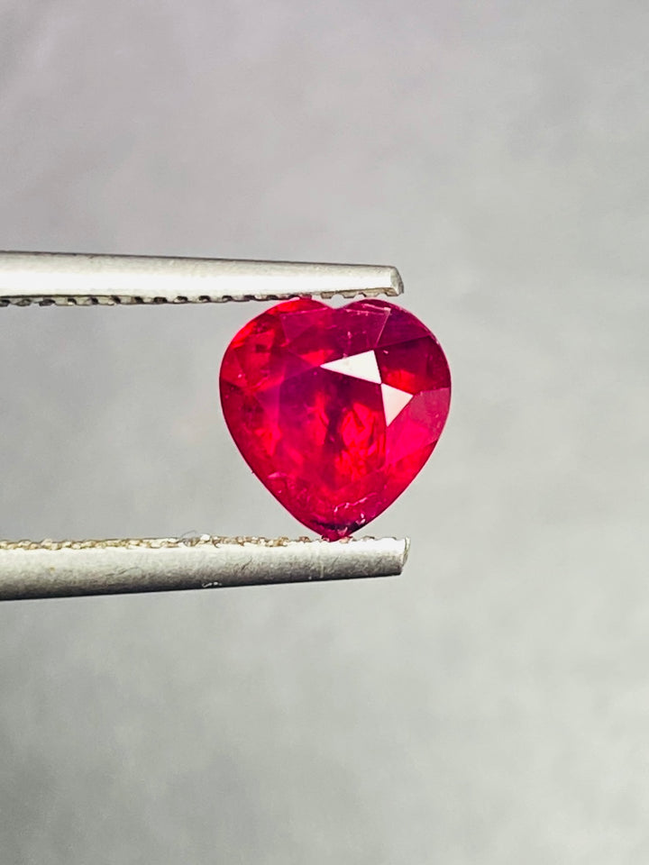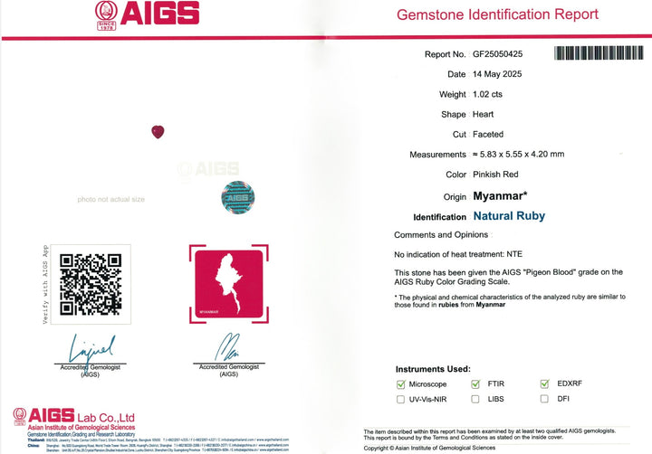 Introducing a captivating heart-shaped natural ruby, certified by AIGS and weighing 1.02 carats. This gemstone features a lovely pinkish-red hue, often likened to the prestigious “Pigeon Blood” color. Mined in Myanmar, a renowned source for exquisite rubies, it embodies both allure and authenticity. Its heart shape symbolizes love and passion, making it ideal for creating meaningful jewelry pieces or enhancing a gemstone collection.
