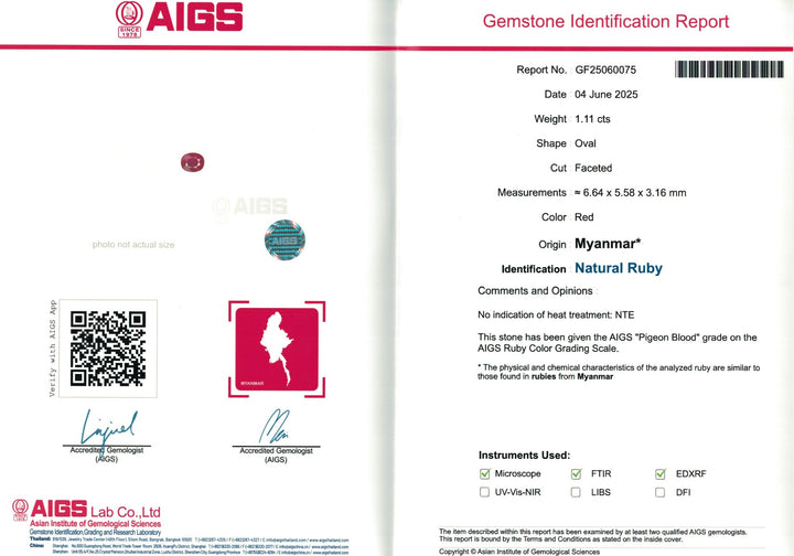 This exceptional 1.11-carat Natural Ruby dazzles with the intense, sought-after Pigeon Blood Red hue. Originating from the illustrious Burmese mines, it features an excellent cut and eye-clean clarity, ensuring it radiates with unmatched brilliance. This ruby is unheated, preserving its natural beauty and authenticity, and is verified by an AIGS certificate. Whether you’re a gemstone collector or a lover of fine jewelry, this gem represents a rare and exquisite find.