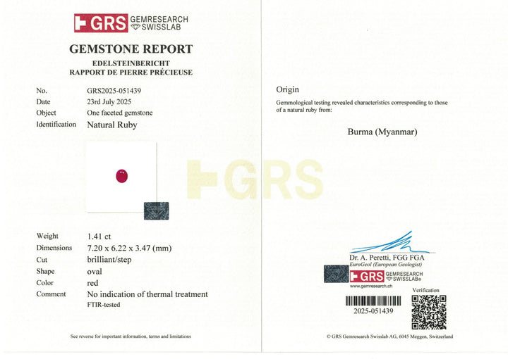 1.41ct GRS Certificate Natural Burma Ruby Unheated Red color eye clean quality Gemstone