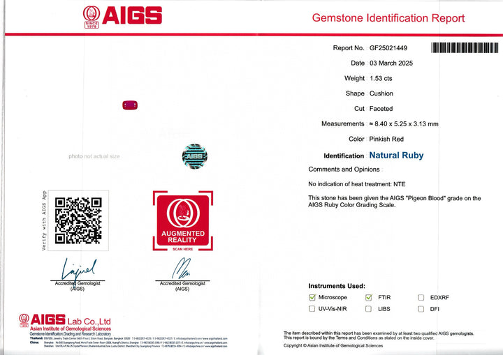 Acquire a piece of nature’s grandeur and elevate your collection with this AIGS Certified 1.53ct Pigeon Blood Ruby. Its unmatched quality and historical depth of color make it a prudent investment in elegance.