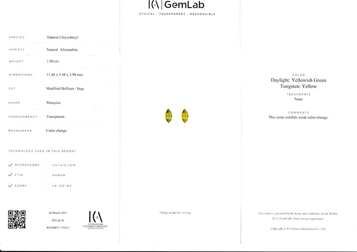 1.8ct ICA Certified Alexandrine color change to orange yellowclean clarity AXA39