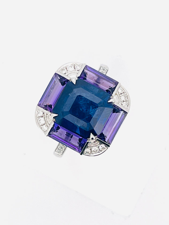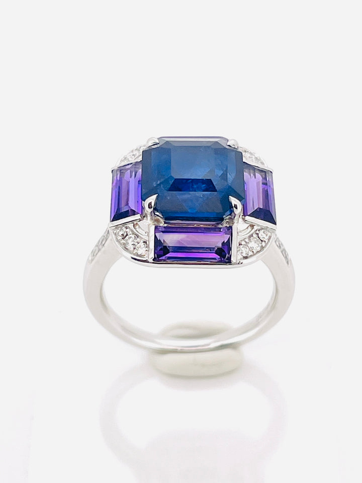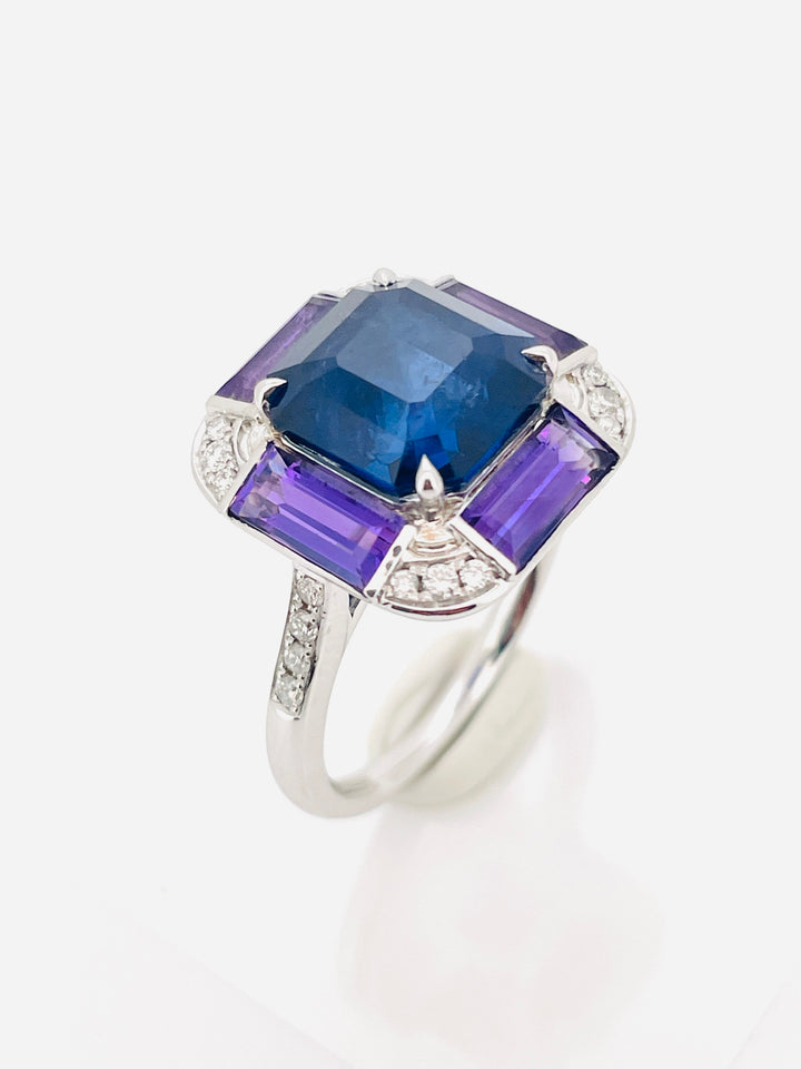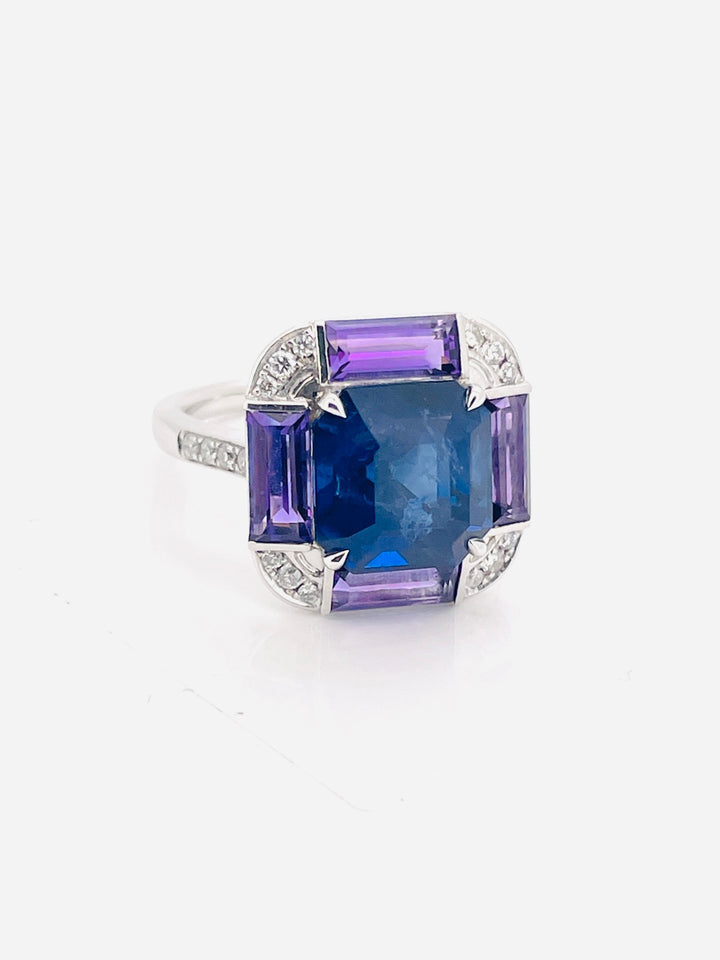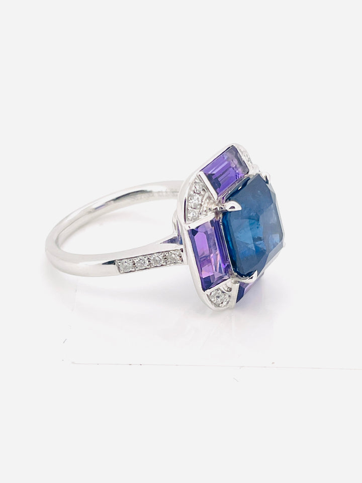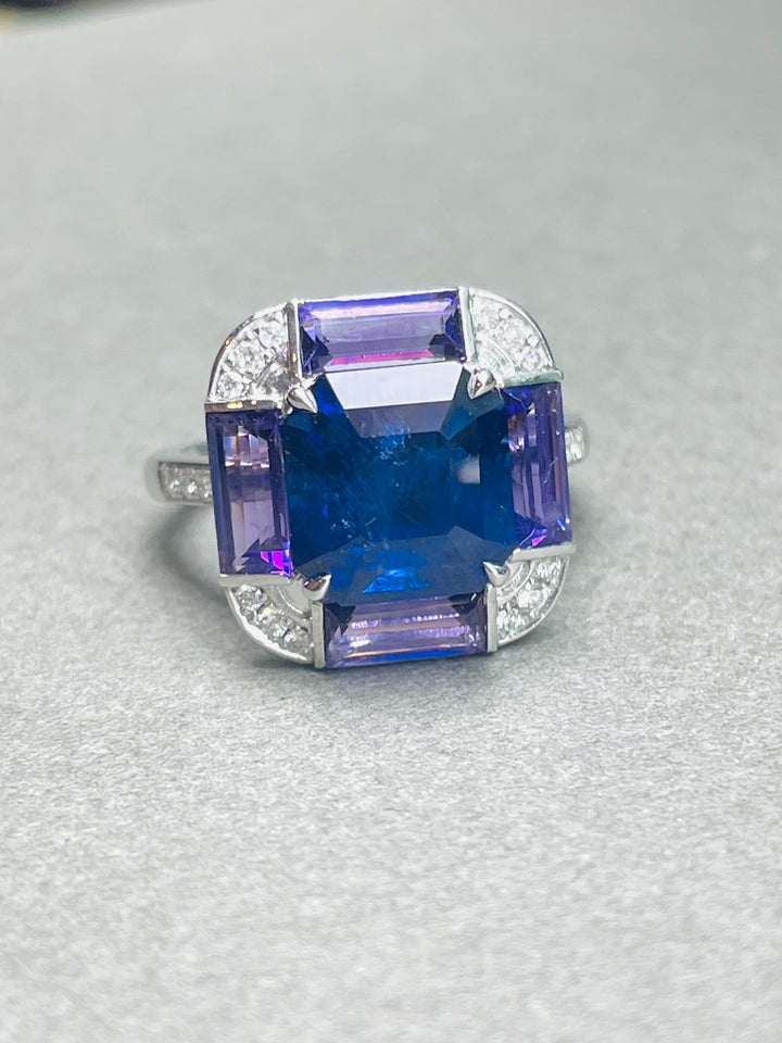 Elevate your jewelry collection with this luxurious sapphire ring, artfully crafted in Platinum Gold 900. The centerpiece is a stunning 6.27 ct heat-treated sapphire from Sri Lanka, celebrated for its rich blue color and brilliance. Surrounding the sapphire, 1.87 ct of amethyst and 0.21 ct of sparkling diamonds enhance its allure, providing a vivid contrast and sophisticated sparkle. At a total weight of 11.40 grams, with a comfortable fit at size 14#HK/USA7#, this ring is perfect for those who appreciate high-end craftsmanship and classic elegance in their jewellery.