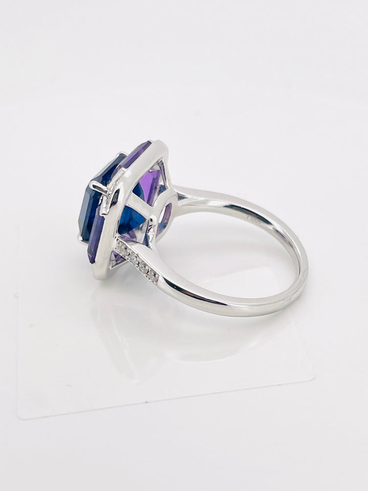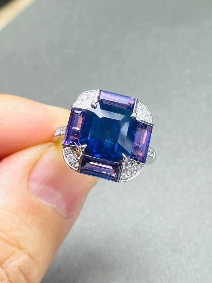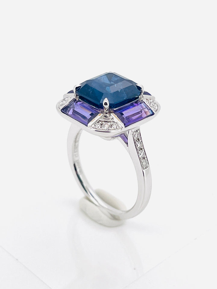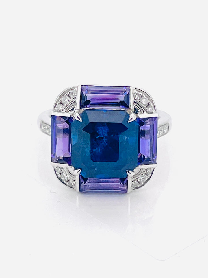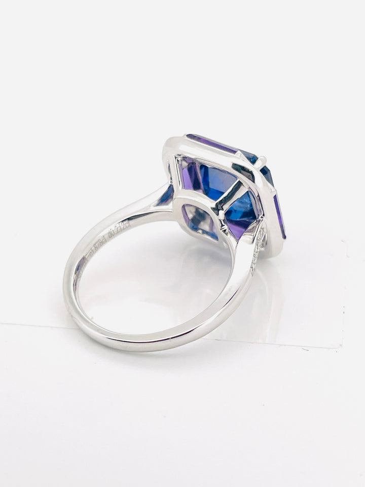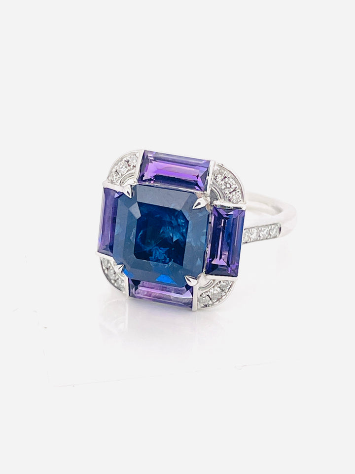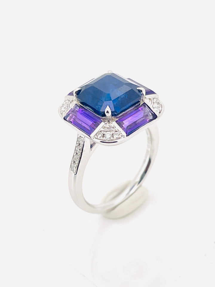 Elevate your jewelry collection with this luxurious sapphire ring, artfully crafted in Platinum Gold 900. The centerpiece is a stunning 6.27 ct heat-treated sapphire from Sri Lanka, celebrated for its rich blue color and brilliance. Surrounding the sapphire, 1.87 ct of amethyst and 0.21 ct of sparkling diamonds enhance its allure, providing a vivid contrast and sophisticated sparkle. At a total weight of 11.40 grams, with a comfortable fit at size 14#HK/USA7#, this ring is perfect for those who appreciate high-end craftsmanship and classic elegance in their jewellery.