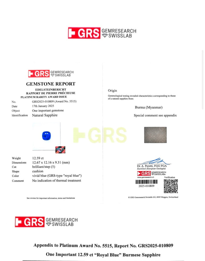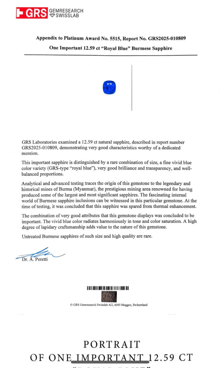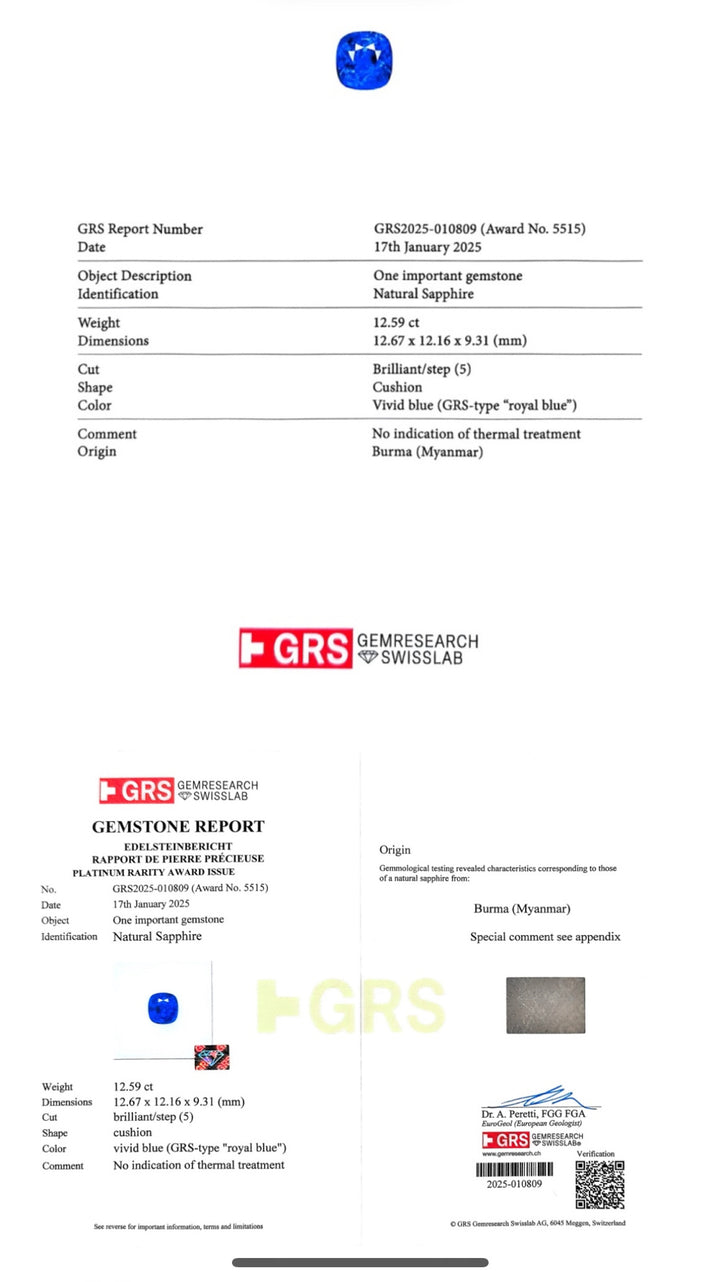 12ct GRS Platinum report Burma unheated sapphire Royal blue Top Collection Wbgem GG16