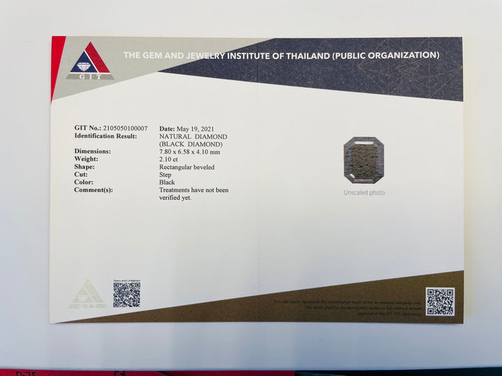 Immerse yourself in the timeless allure of this 2.10ct natural black diamond, showcasing a captivating deep black hue with eye clean clarity. Its very good cut enhances the stone's natural brilliance, making it an ideal choice for those seeking unique and luxurious jewelry pieces. This diamond comes with a GIT laboratory report, confirming its exceptional quality and natural origins. Whether for a striking ring or a statement necklace, this black diamond adds sophistication and elegance to any collection.