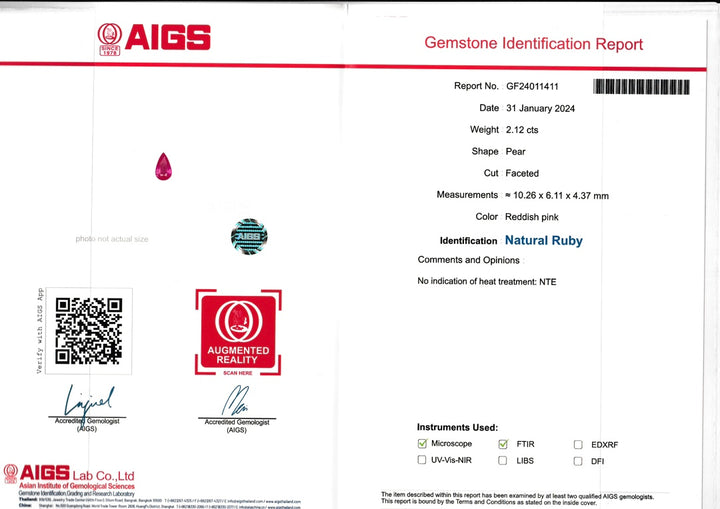 Unearth the elegance encapsulated in this 2.12Ct Mozambique Pinkish Red Ruby. With its distinct pear cut, this ruby brings together contemporary charm and classic sophistication, making it a coveted gem for bespoke jewelry creations. AIGS certified, the ruby showcases a vibrant pinkish-red hue and natural beauty, as there is no indication of heat treatment. Originating from Mozambique, a premier source of fine rubies, this gemstone guarantees authenticity and superior quality. Its splendid color and unique shape make it ideal for anyone seeking an eye-catching and genuine piece of nature's artistry.