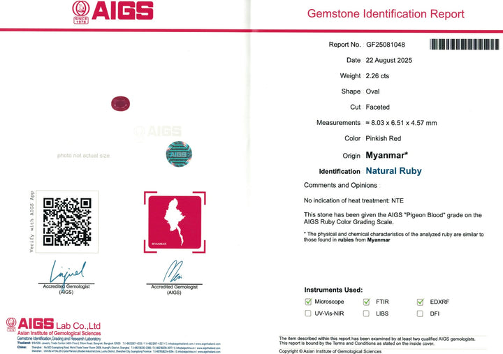 Presenting a stunning natural ruby certified by AIGS, weighing 2.26 carats. This exquisite gemstone, with its classic oval shape, captivates with a vibrant pinkish-red color, often described as resembling the revered “Pigeon Blood” hue. Originating from Myanmar, known for producing some of the world's finest rubies, this gem is a must-have for both jewelry enthusiasts and gemstone collectors alike. The certification ensures both authenticity and quality, making it an invaluable addition to your collection.