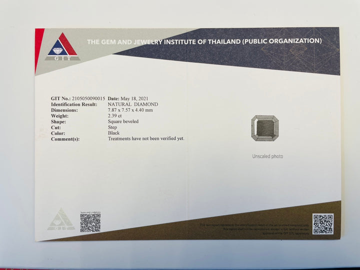 Delve into the exquisite beauty of this 2.39ct natural black diamond from Africa, a gem that embodies both elegance and rarity. With its eye clean clarity, this diamond showcases a flawless appearance, enhanced further by a very good cut that maximizes its captivating black hue. Accompanied by a GIT certificate, this unheated gemstone promises authenticity and high quality. Its unique charm makes it the perfect choice for bespoke jewelry pieces that make a statement of luxury and sophistication.