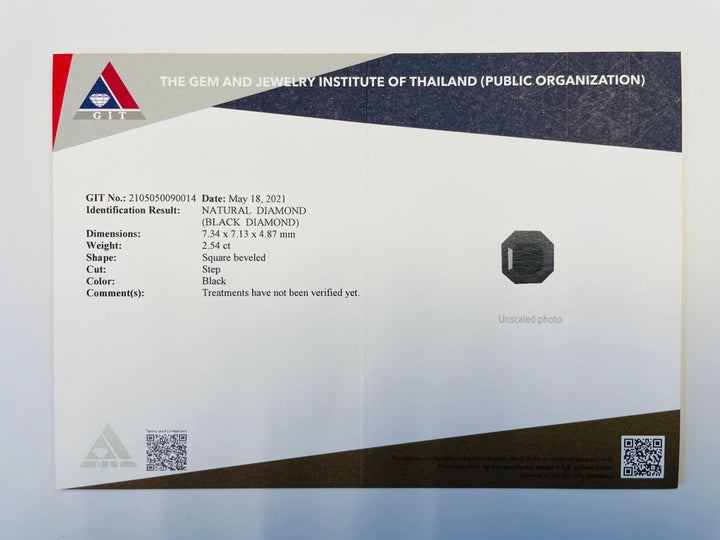Experience the allure of this 2.54 Ct natural black diamond, perfect for the discerning collector or jeweler. Sourced from Africa, this diamond is a symbol of natural beauty and rarity. With eye-clean clarity and a very good cut, it captures and reflects light in an enchanting manner. The diamond has undergone heating treatment to enhance its rich black color, ensuring it stands out in any jewelry piece. Accompanied by a GIT laboratory report, this diamond offers authenticity and confidence in your purchase. Whether you're looking to craft a statement ring, pendant, or other jewelry masterpieces, this black diamond offers unparalleled elegance and style.