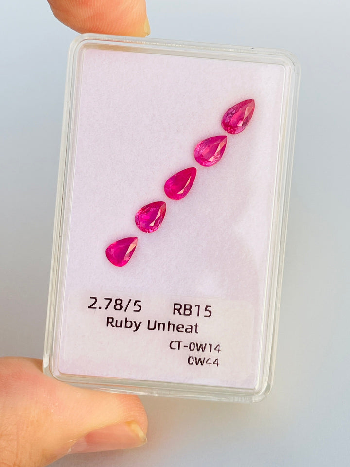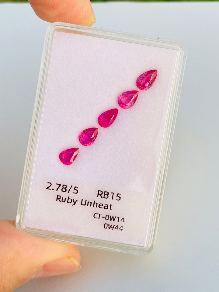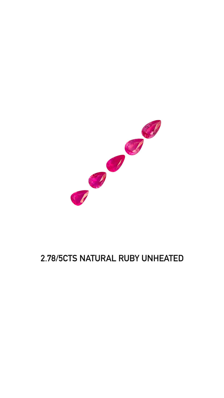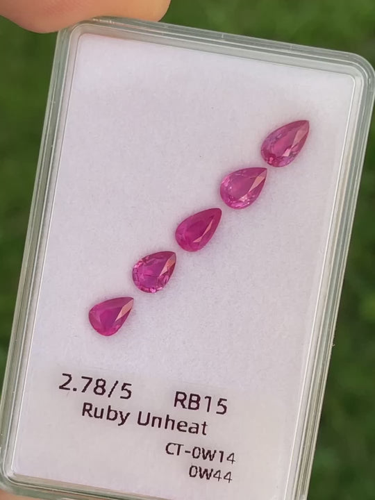 Elevate your jewelry designs with our remarkable 2.78ct set of natural ruby gemstones from Mozambique. Comprising five expertly cut pear-shaped rubies, this set showcases the desirable pink-red color that is synonymous with high-quality corundum. Each gem boasts eye-clean clarity and an excellent cut, highlighting their natural beauty and allure. Unheated and untreated, these rubies provide an authentic glimpse into the Earth's artistry, making them perfect for collectors and jewelry creators seeking genuine elegance. This set is an excellent choice for crafting bespoke jewelry or enhancing an existing collection with timeless sophistication.