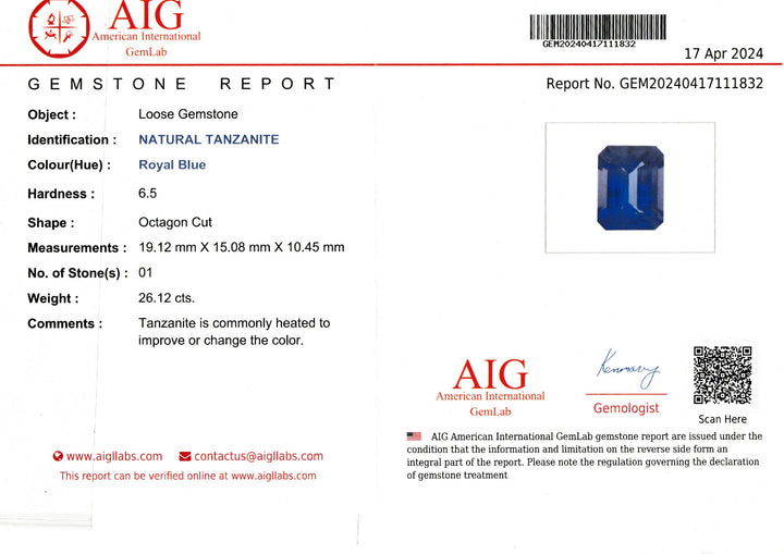Unveil the grandeur of our Natural Tanzanite gemstone originating from Tanzania, renowned for its exceptional size and captivating black/royal blue color. Weighing in at an impressive 26.1 carats, this Tanzanite exhibits an excellent cut that enhances its radiant beauty and showcases the gemstone's inherent luster. With a loop clean clarity, this Tanzanite is virtually flawless, making it a prime example of top-tier gemstone quality. The piece is certified with a laboratory report, providing assurance of its authenticity and characteristics. This exquisite gem is a magnificent choice for collectors and connoisseurs seeking a rare and stunningly beautiful gem to elevate their collection.