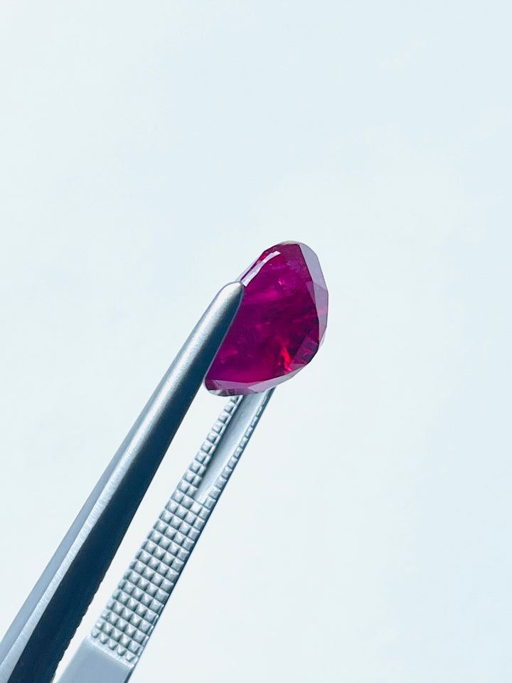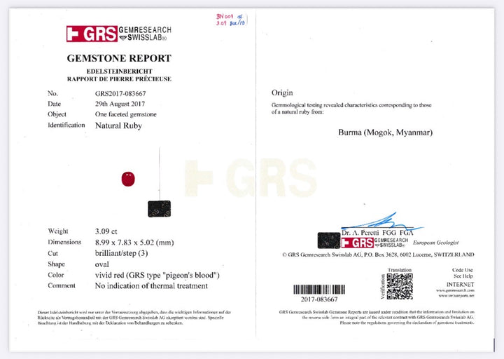 Explore the timeless elegance of our Natural Ruby, a superior variety of corundum sourced from the renowned mines of Burma. Weighing 3.09 carats, this exquisite gemstone is treasured for its rare pigeon’s blood red color, considered the pinnacle of ruby hues. The brilliant/step cut enhances its breathtaking radiance, while its eye-clean clarity ensures an unhindered view of its natural beauty. Unheated and certified by GRS (Report #GRS2017-083667), this ruby retains its untreated natural grandeur, making it a coveted piece for discerning collectors and fine jewelry connoisseurs. Let this remarkable gem illuminate your collection with its legendary allure.