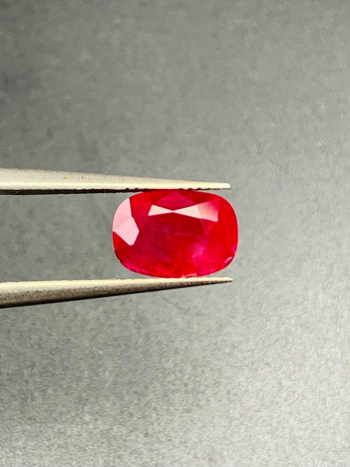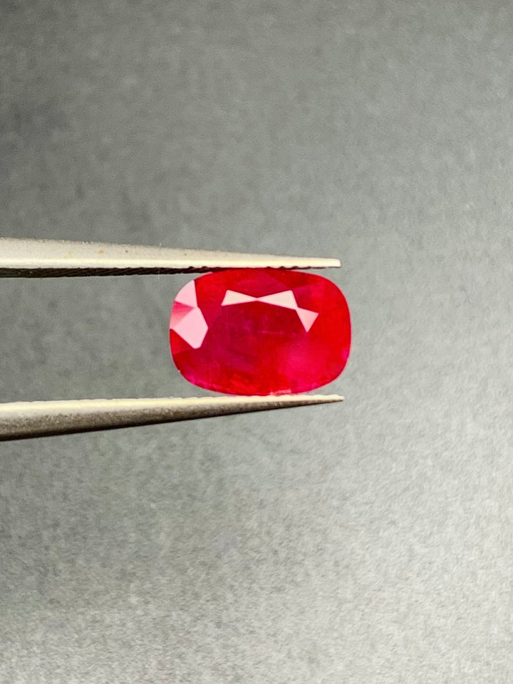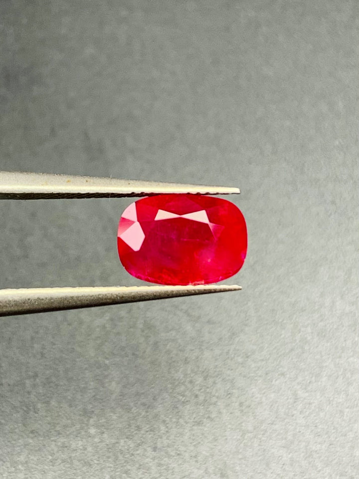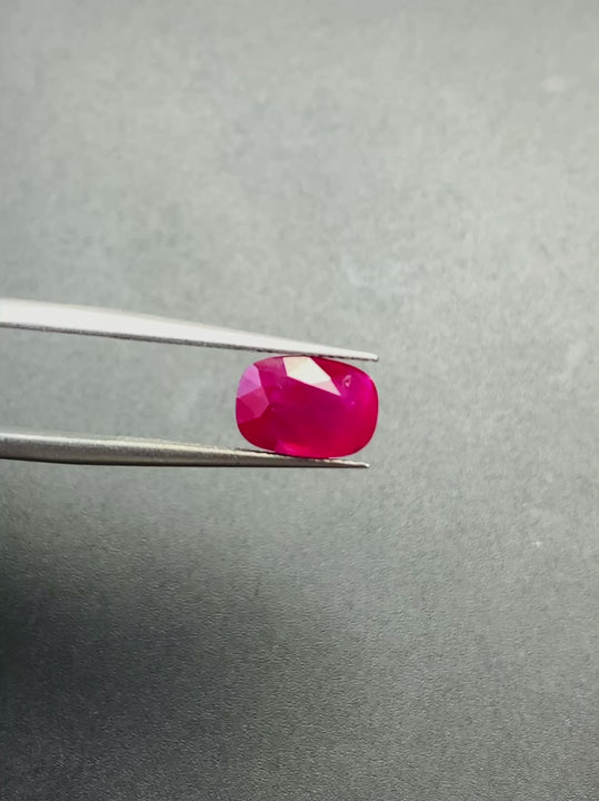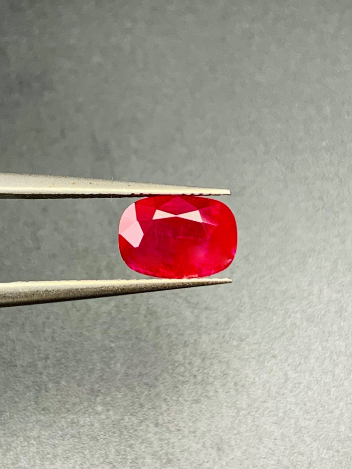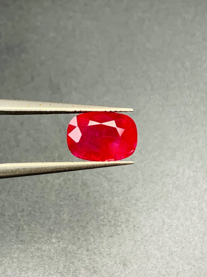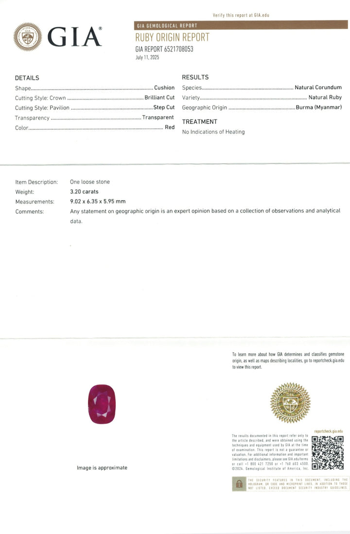 Experience the charm of this 3.20-carat natural ruby, radiating with an enchanting red color that epitomizes pure elegance. Unearthed from the legendary ruby mines of Burma (Myanmar), this gem has been meticulously certified by the GIA, confirming its natural state without any heat treatment. With its cushion shape and brilliant cut crown enhanced by a step cut pavilion, this ruby is ideal for creating sophisticated jewelry or serving as a standout element in a curated gemstone collection.
