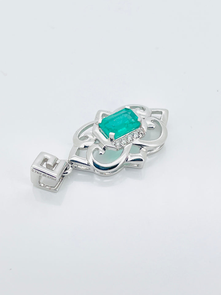 Add a touch of opulence to your jewelry collection with this sophisticated pendant showcasing a 0.74-carat Colombian emerald, known for its vivid green hue and eye-clean purity. Enhanced by 0.07ct of brilliant diamonds with F-G color and VS clarity, this piece radiates elegance and luxury. Crafted in 18k white gold, the pendant is perfect for those who appreciate fine jewelry with a touch of sophistication. Certified by GFCO with certificate number AUP296, this pendant is both an exquisite accessory and a valuable investment.