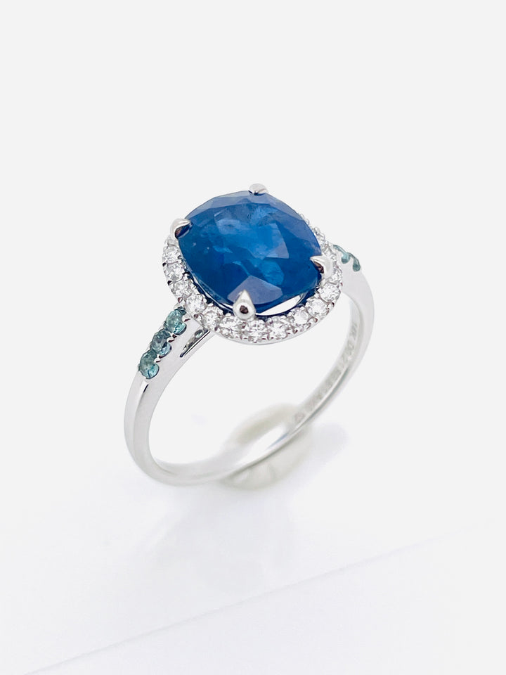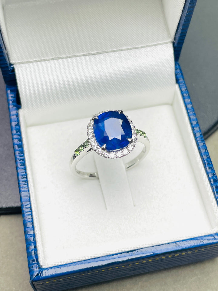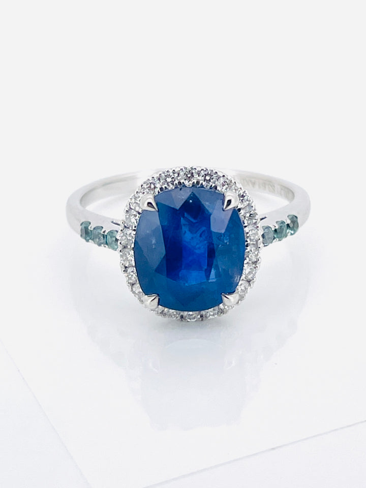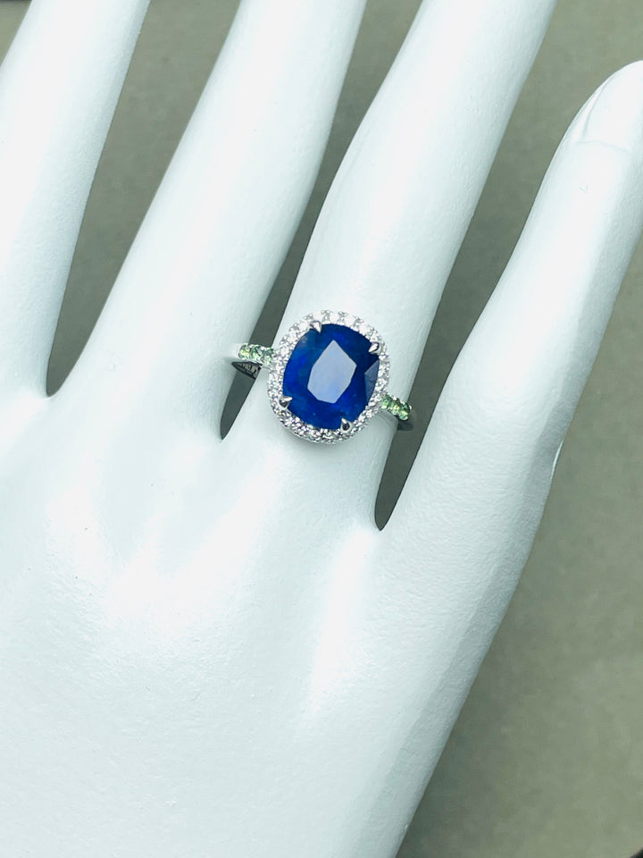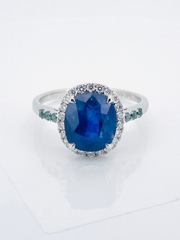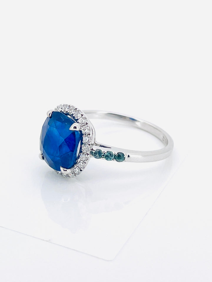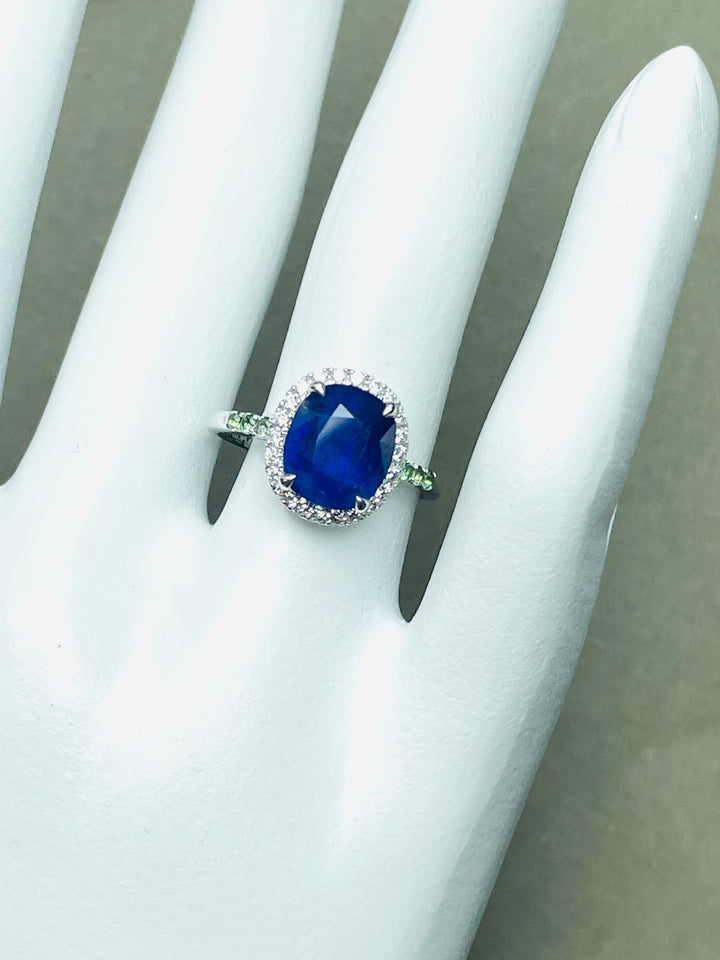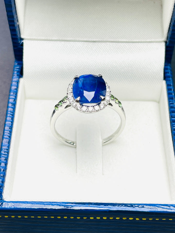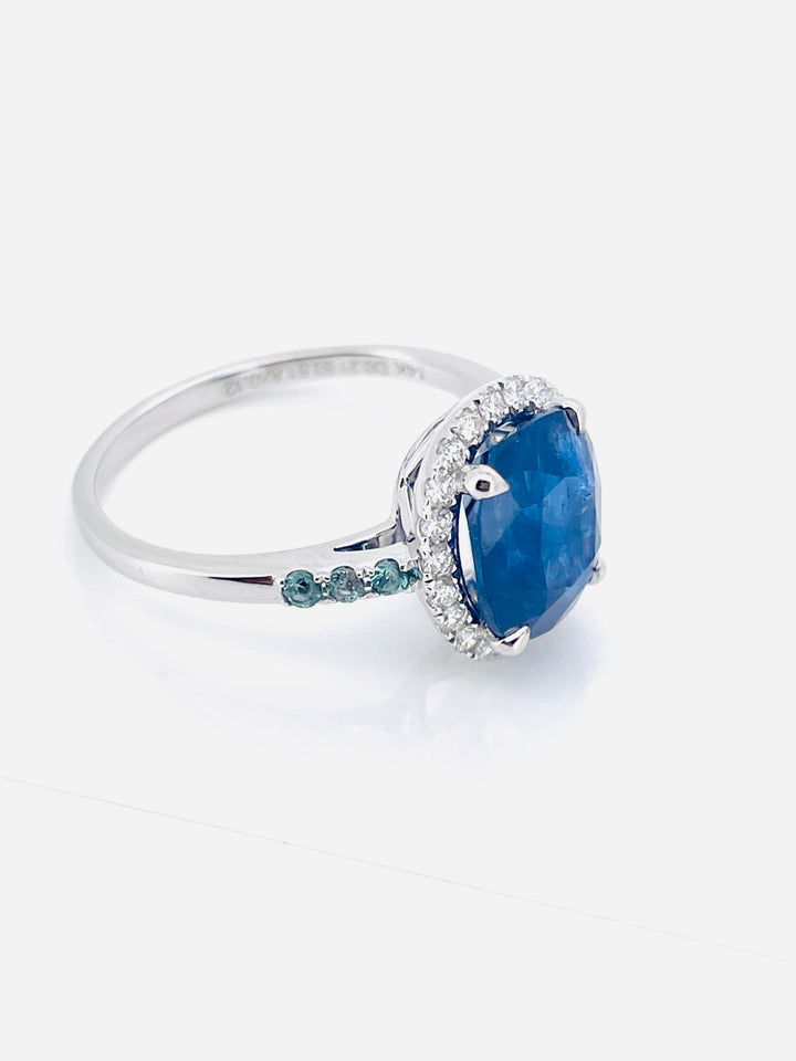 Elevate your jewelry collection with this exquisite 14K white gold ring, centered with a breathtaking 3.61 carat cornflower blue sapphire known for its captivating clarity and rich hue. The main stone is expertly complemented by 0.12ct alexandrite and 0.21ct G VVS diamonds, adding a touch of brilliance to the elegant design. With its timeless allure and sophisticated craftsmanship, this ring is perfect for both special occasions and everyday luxury. A true testament to elegance and style, this piece is as versatile as it is stunning. Whether worn as a statement piece or given as a thoughtful gift, this sapphire and diamond ring is sure to leave a lasting impression.