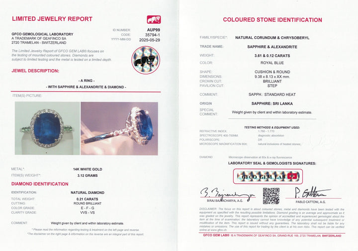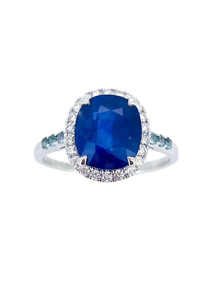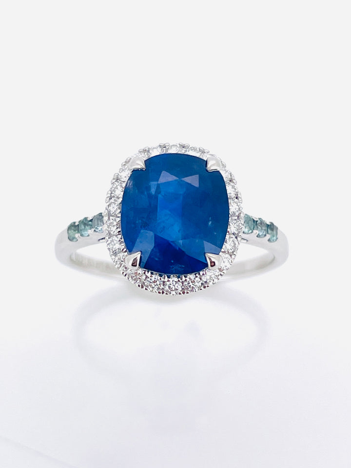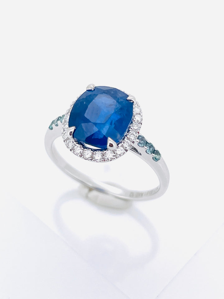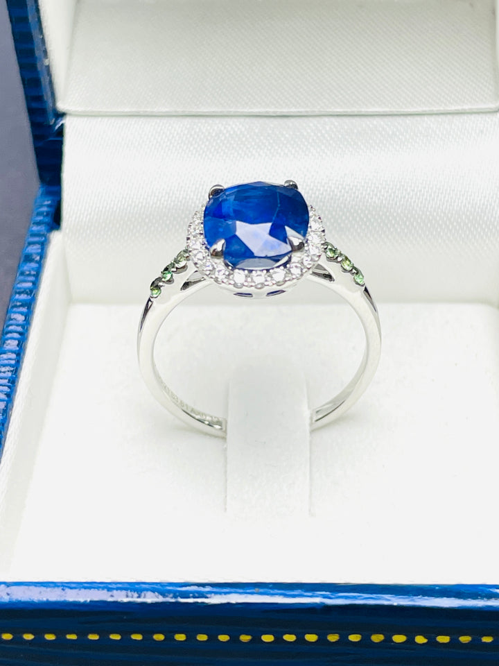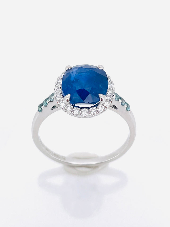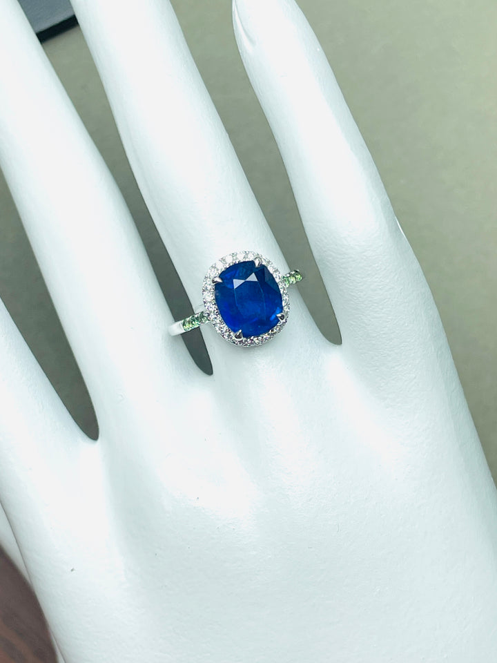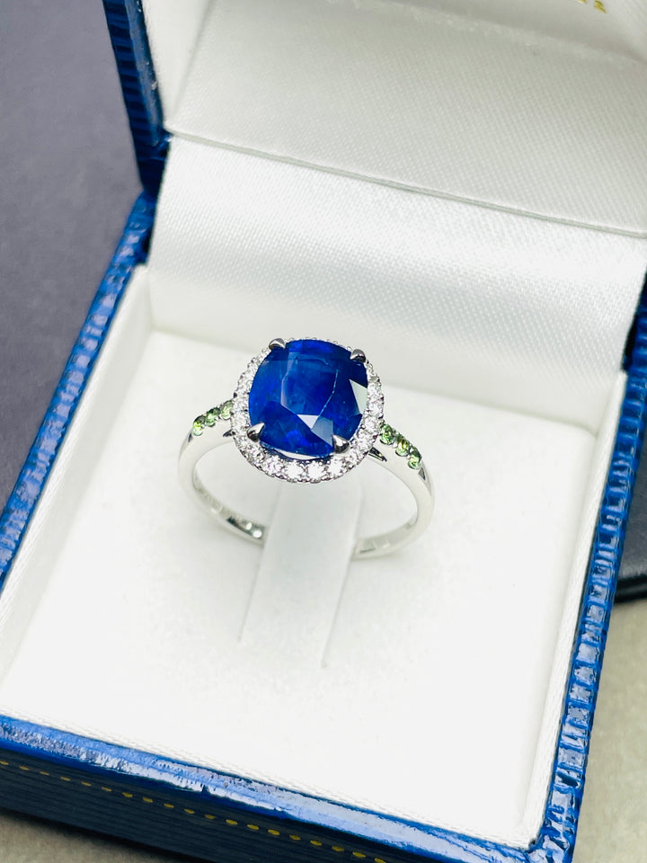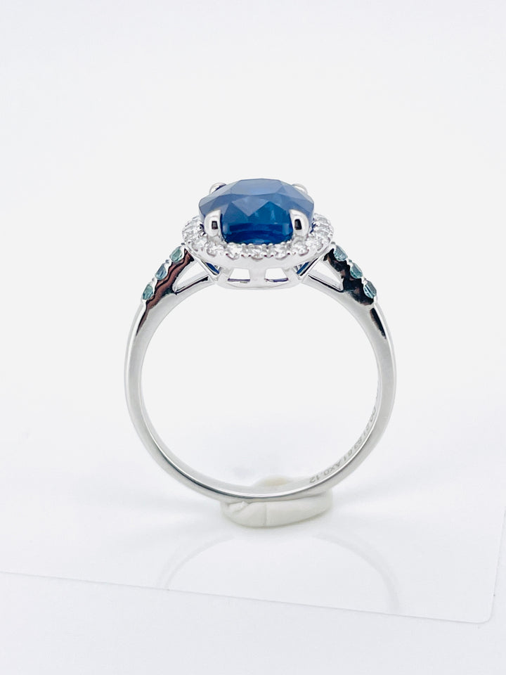 Elevate your jewelry collection with this exquisite 14K white gold ring, centered with a breathtaking 3.61 carat cornflower blue sapphire known for its captivating clarity and rich hue. The main stone is expertly complemented by 0.12ct alexandrite and 0.21ct G VVS diamonds, adding a touch of brilliance to the elegant design. With its timeless allure and sophisticated craftsmanship, this ring is perfect for both special occasions and everyday luxury. A true testament to elegance and style, this piece is as versatile as it is stunning. Whether worn as a statement piece or given as a thoughtful gift, this sapphire and diamond ring is sure to leave a lasting impression.