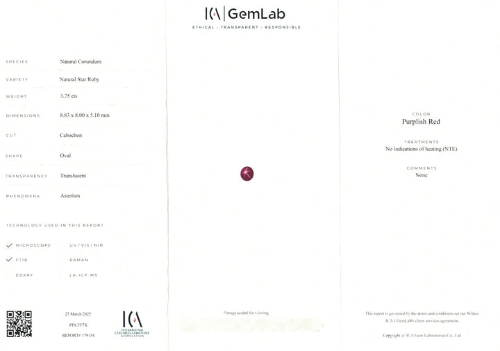 3.75ct Unheated Star Ruby - Purple Red Gem from Burma, ICA Certified