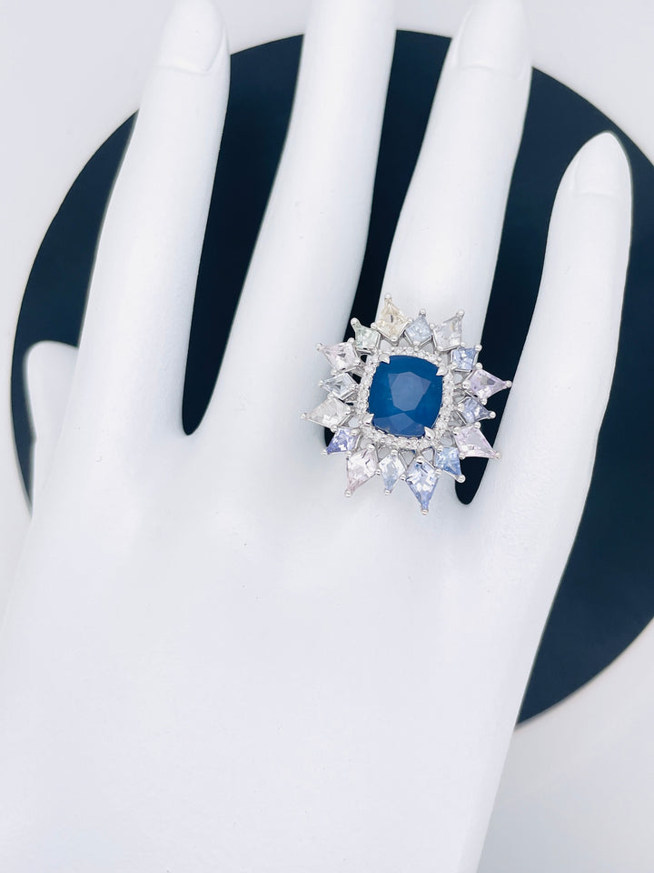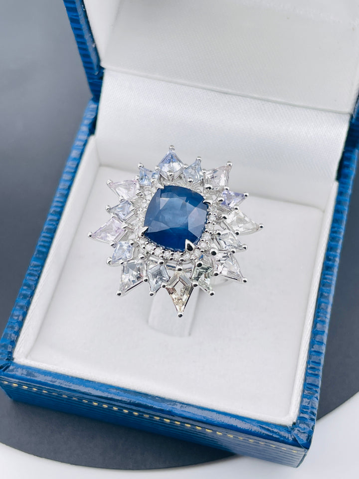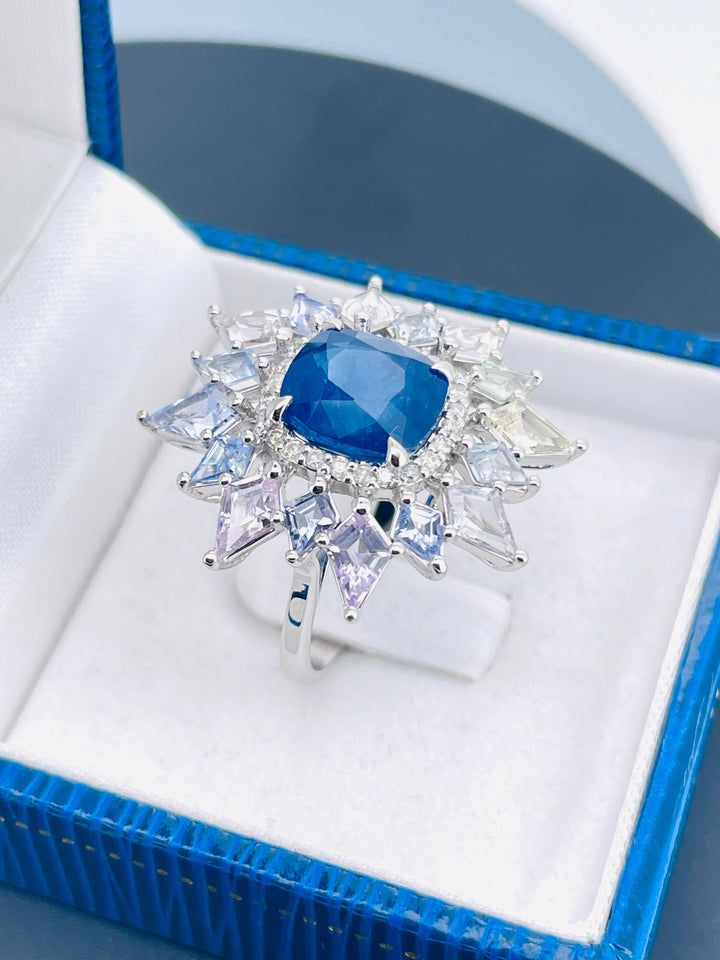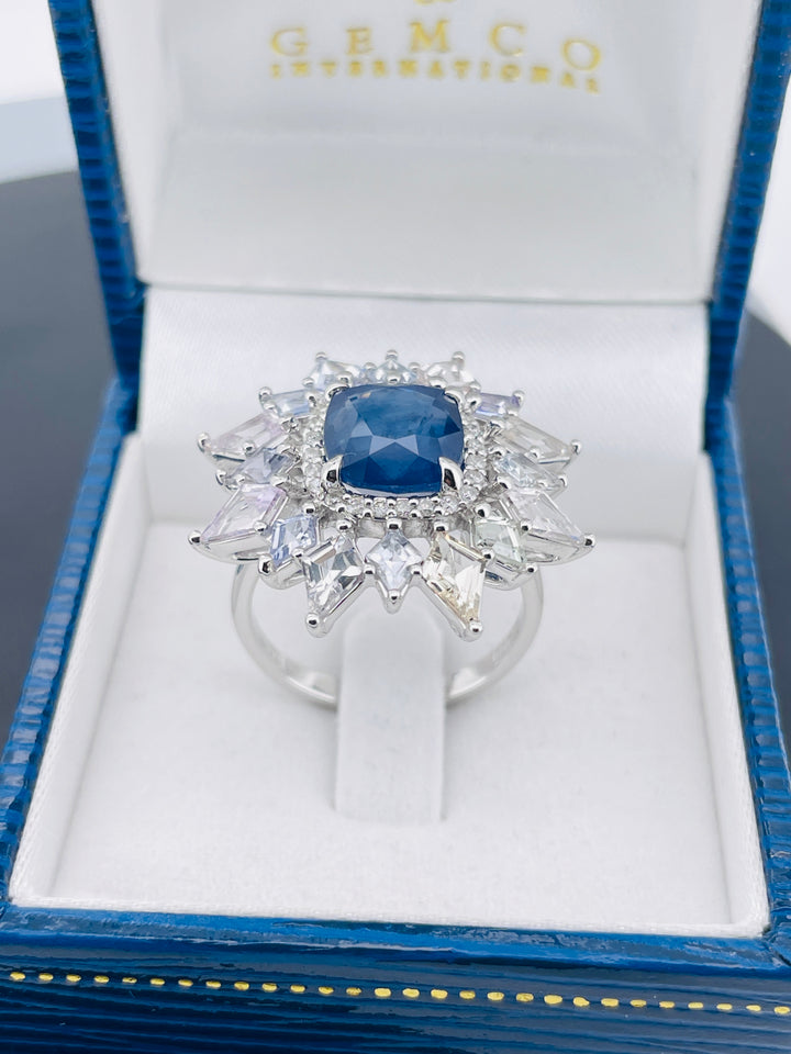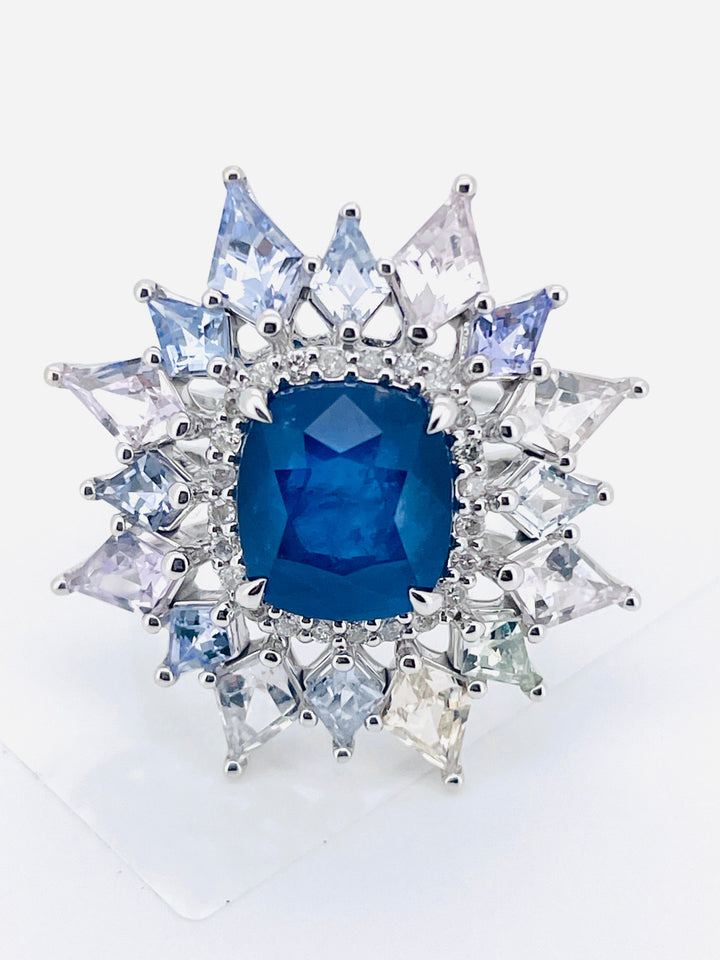 The ring features a cushion-cut main sapphire, surrounded by various shapes of fancy sapphires for a dazzling look.