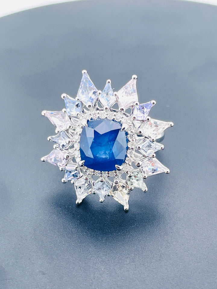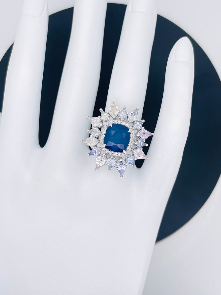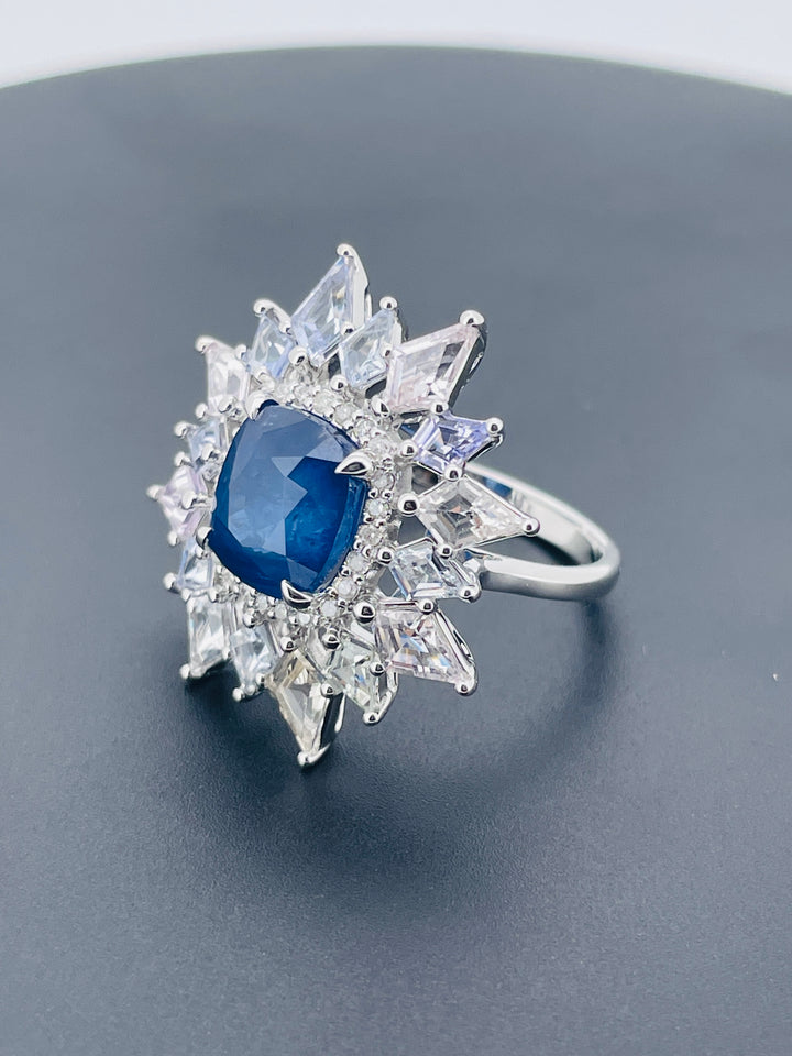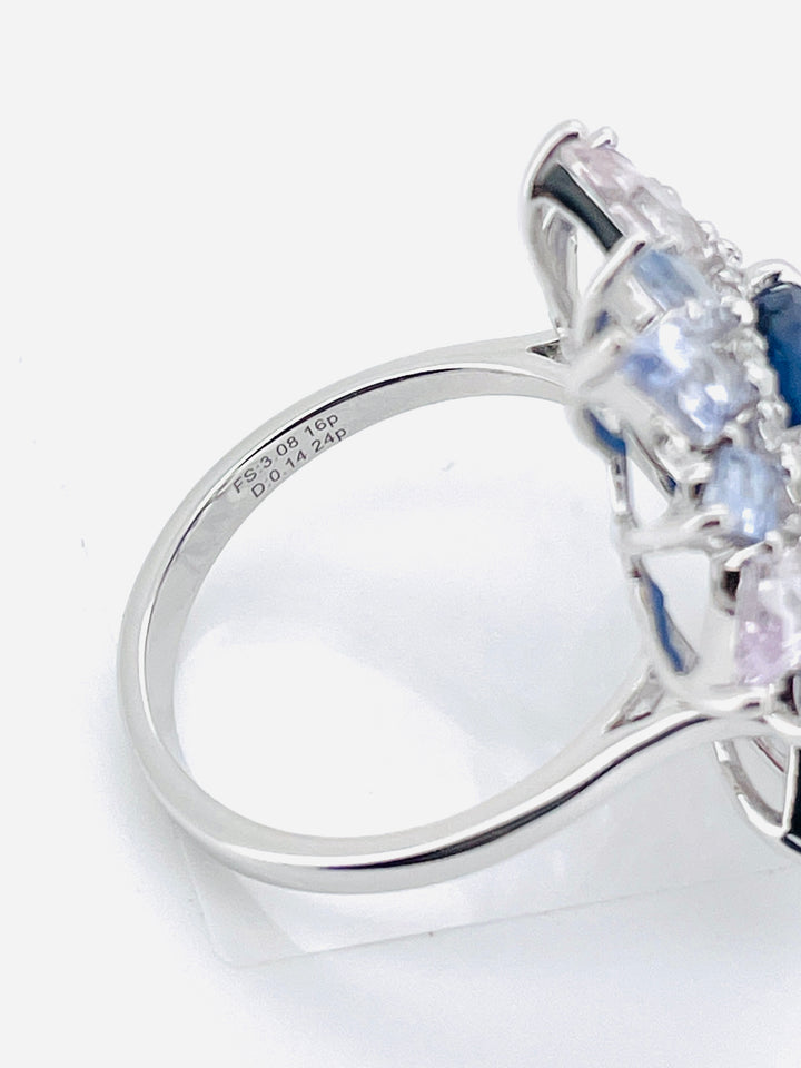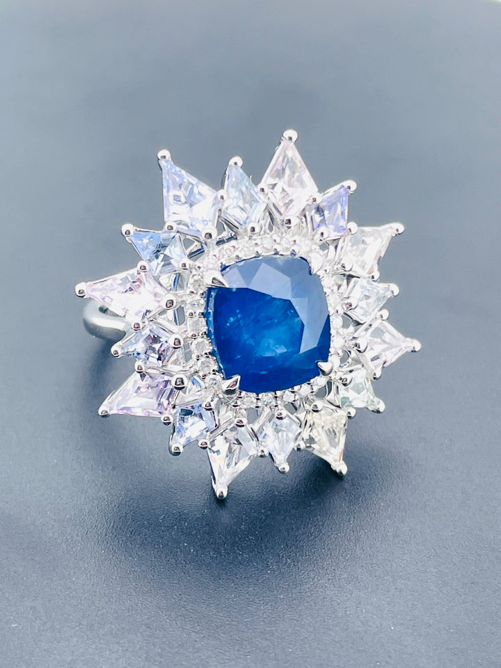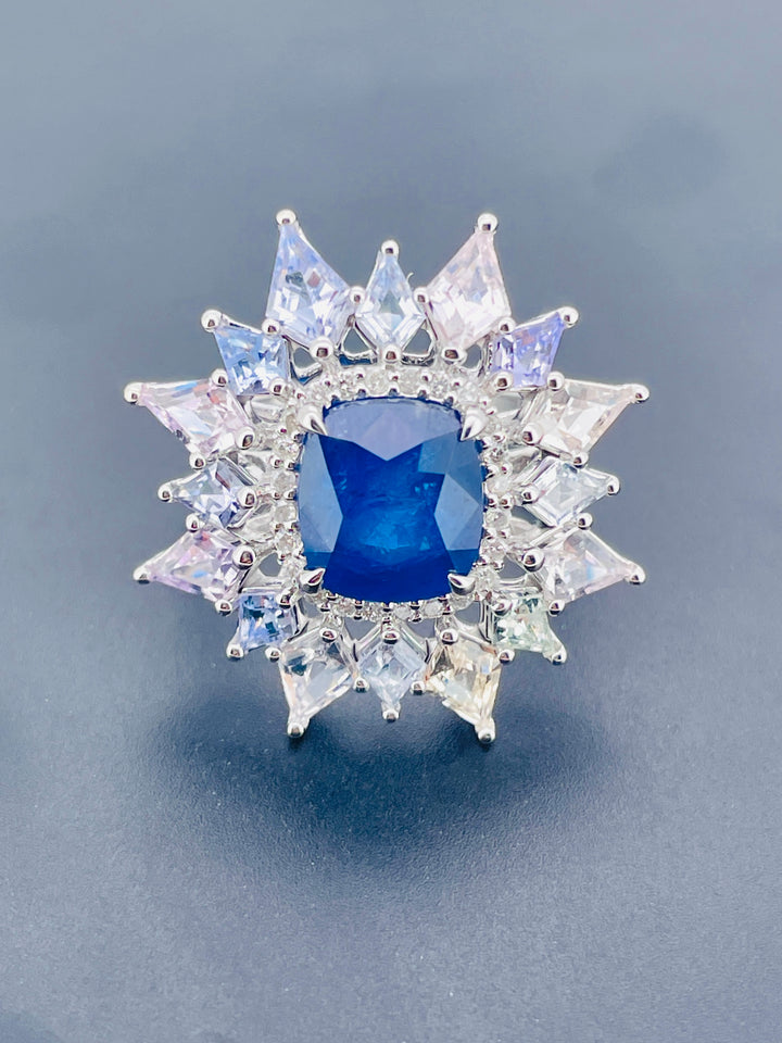 The ring features a cushion-cut main sapphire, surrounded by various shapes of fancy sapphires for a dazzling look.