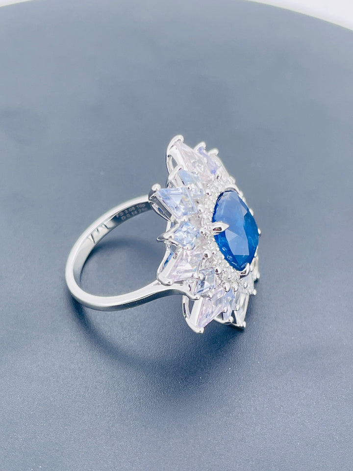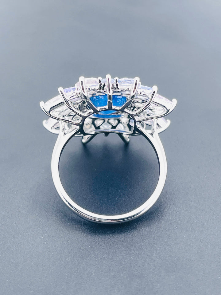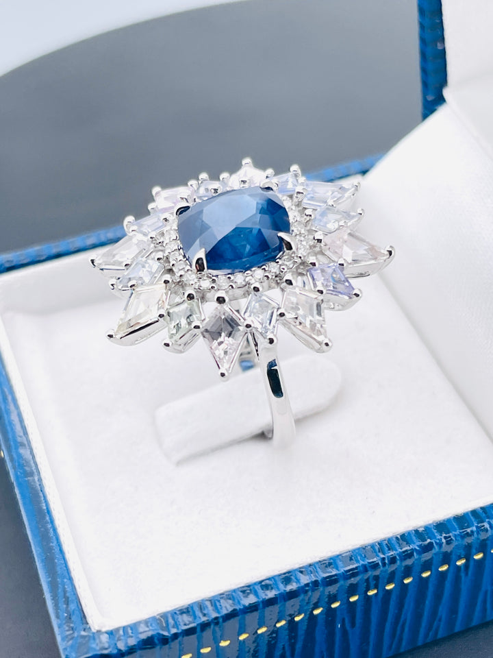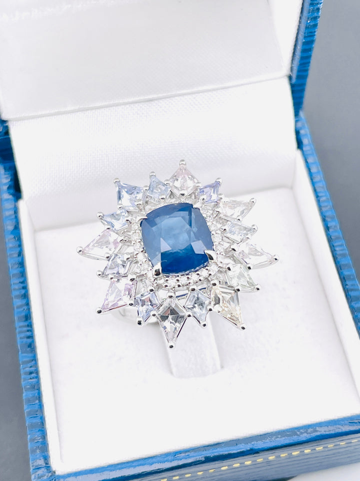 Exquisite 14K White Gold Royal Blue Sapphire Ring with Fancy Sapphires and Diamonds