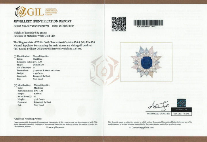 Immerse yourself in luxury with this breathtaking 14K White Gold ring, showcasing the magnificence of natural gemstones. The centerpiece, a 4.45ct Royal Blue Sapphire, glows with vivid beauty, artfully enhanced by a halo of 3.08ct natural fancy sapphires. Delicate accents of 0.14ct sparkling diamonds add a touch of opulence. This exquisite piece is carefully crafted to adorn any occasion, bringing a timeless elegance to your collection.