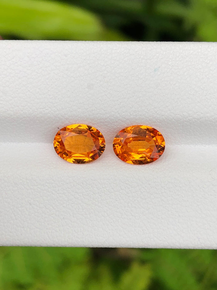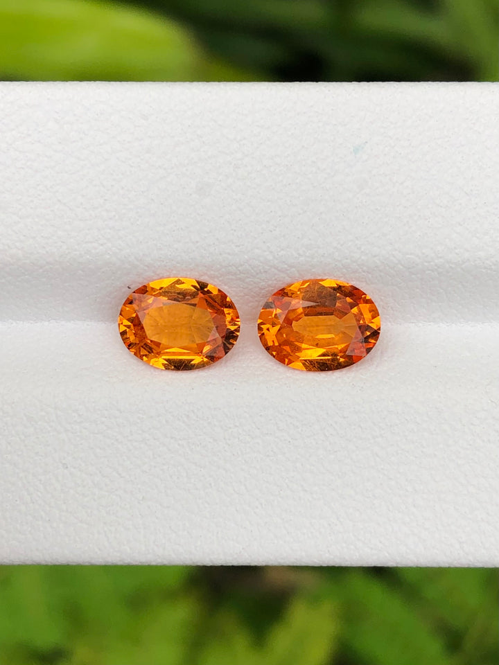 Illuminate your jewelry collection with this exquisite pair of Spessartite Garnets, totaling 5.45 carats. These gemstones are renowned for their vibrant orange color, which shines brilliantly, adding warmth and sparkle to any design. Each gem in this well-matched pair exhibits high quality and exceptional brilliance, making them ideal for creating sophisticated earrings or bespoke jewelry pieces. Whether used for a special jewelry commission or added to a gem collection, these Spessartite Garnets offer a captivating, fiery allure that's hard to resist.