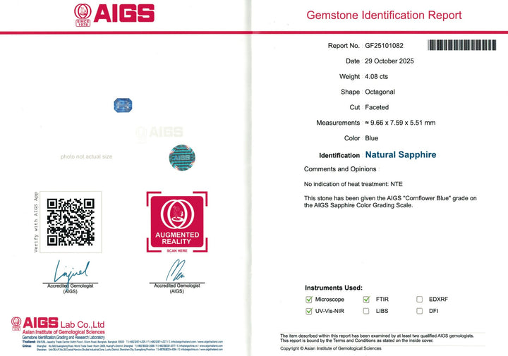 Certified by AIGS (Report No: GF25101082), this unheated sapphire assures authenticity and integrity with no treatments, preserving its natural beauty. Its cornflower blue color resonates with sophistication, making it a standout piece suitable for high-end custom jewelry or discerning investors seeking a rare gemstone.