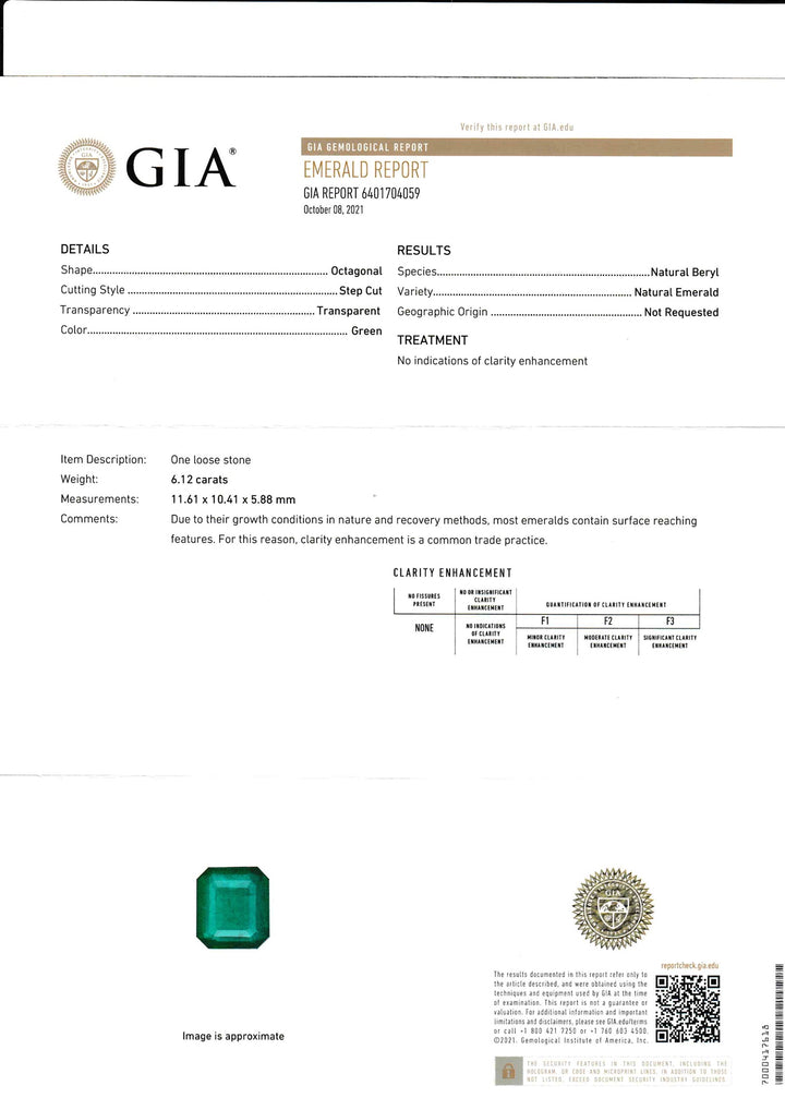 GIA certificate 6.12carat natural no oil Emerald no treatment loose stone gemstone WB Gems EMA19