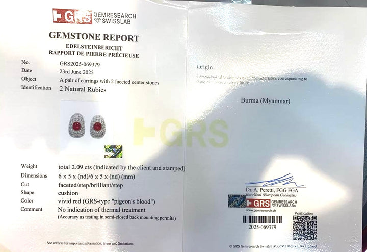 Unheated Burma Ruby Earrings 2.09ct – Pigeon Blood Color, GRS Certified