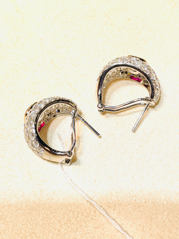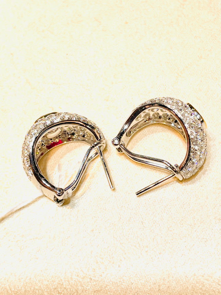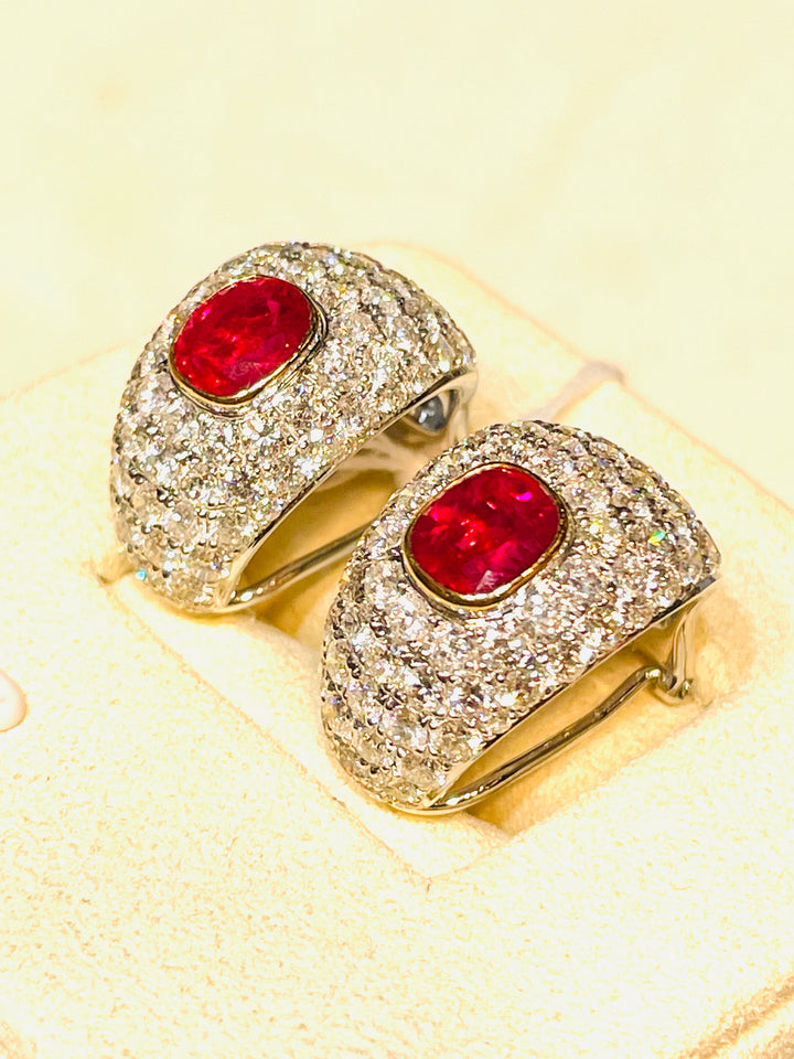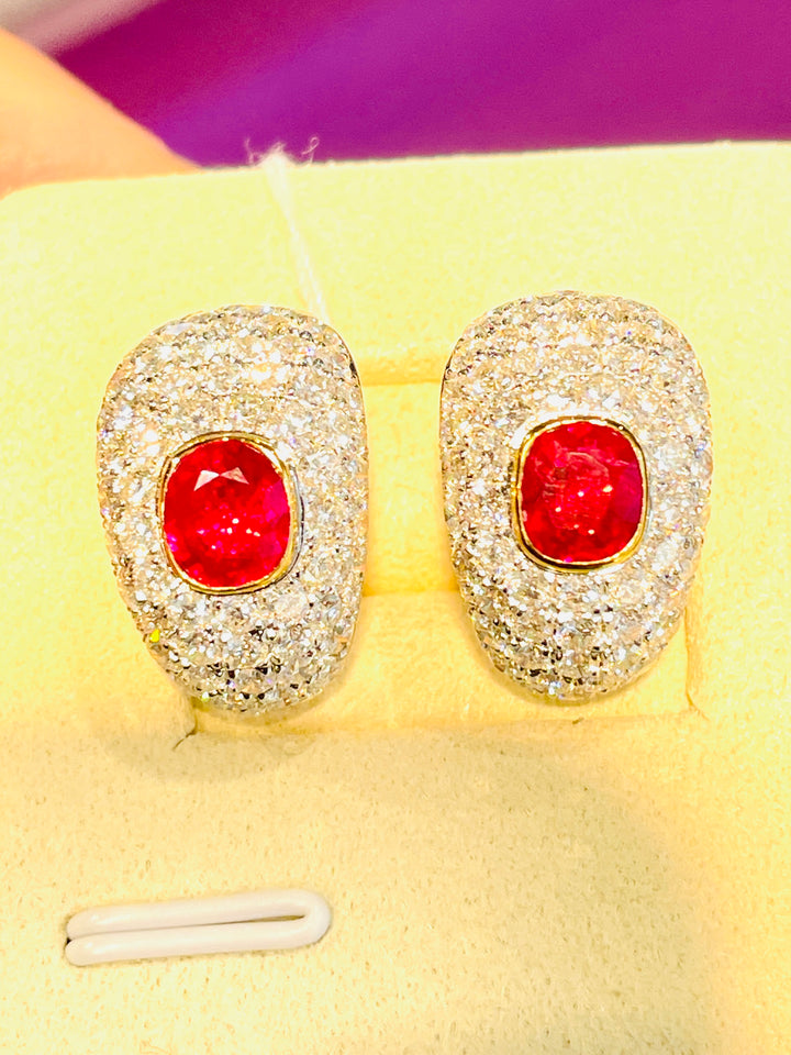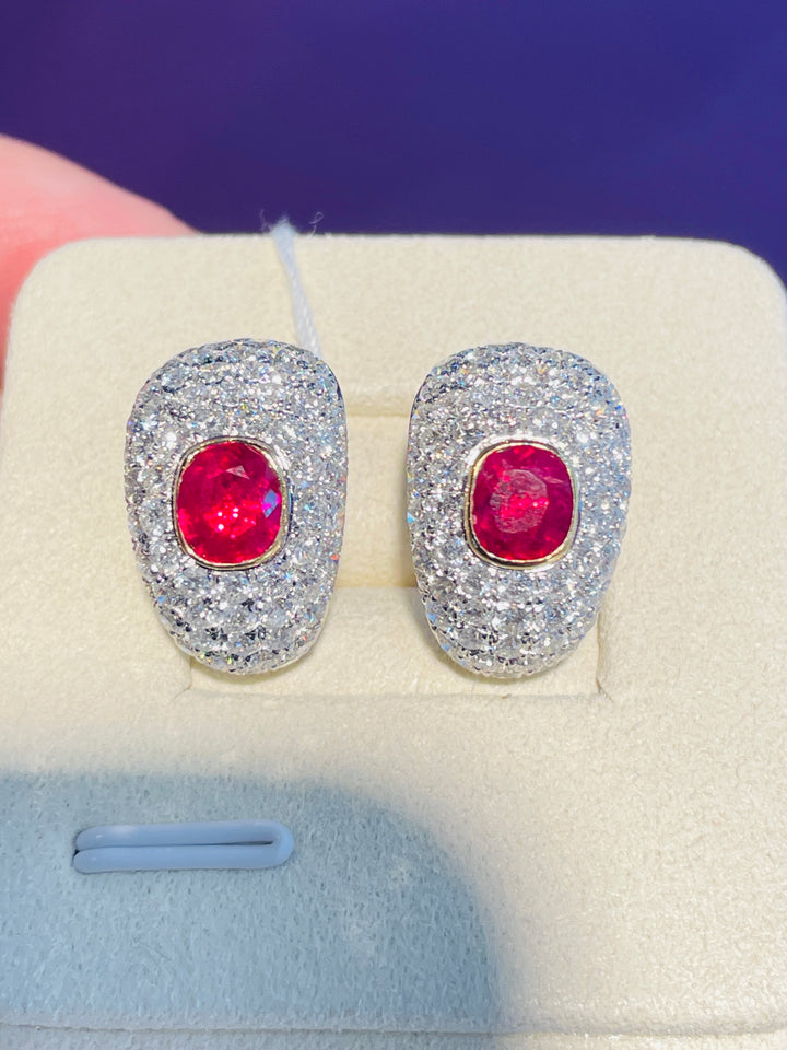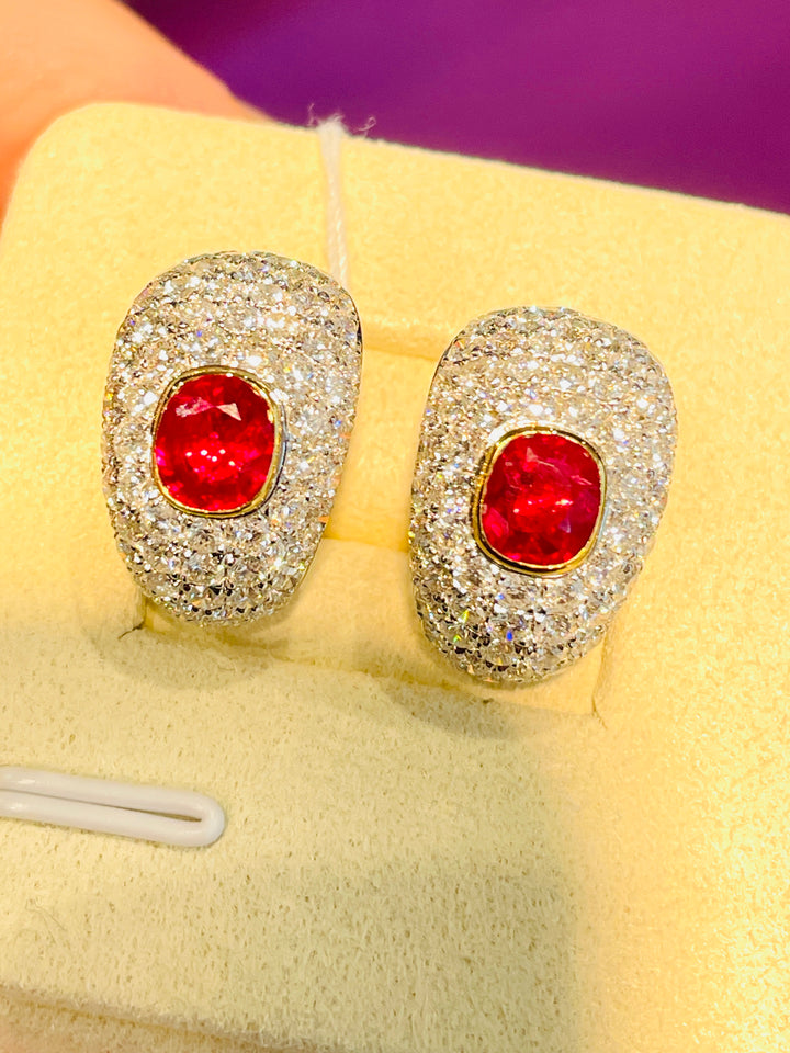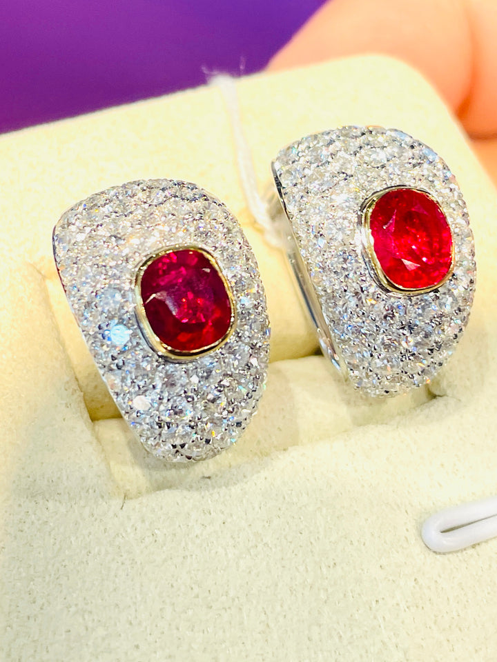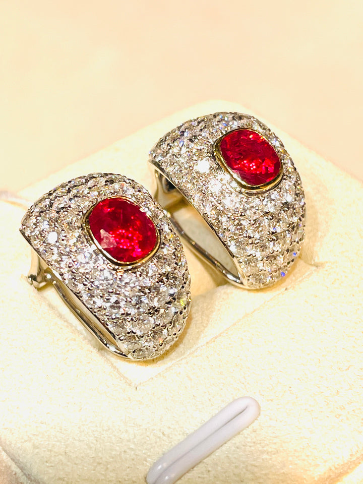 Introducing an opulent pair of earrings featuring two exquisite natural Burma rubies, weighing a total of 2.09 carats. These gems are celebrated for their coveted pigeon blood color, recognized globally as the pinnacle of ruby hues. Skillfully faceted with an excellent cut, these rubies exude unmatched brilliance and elegance, adding a touch of luxury to any ensemble.