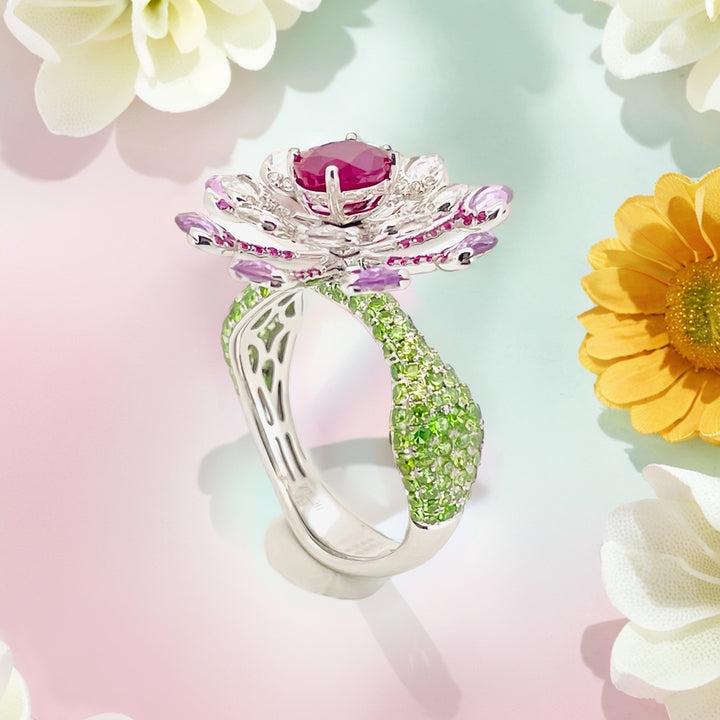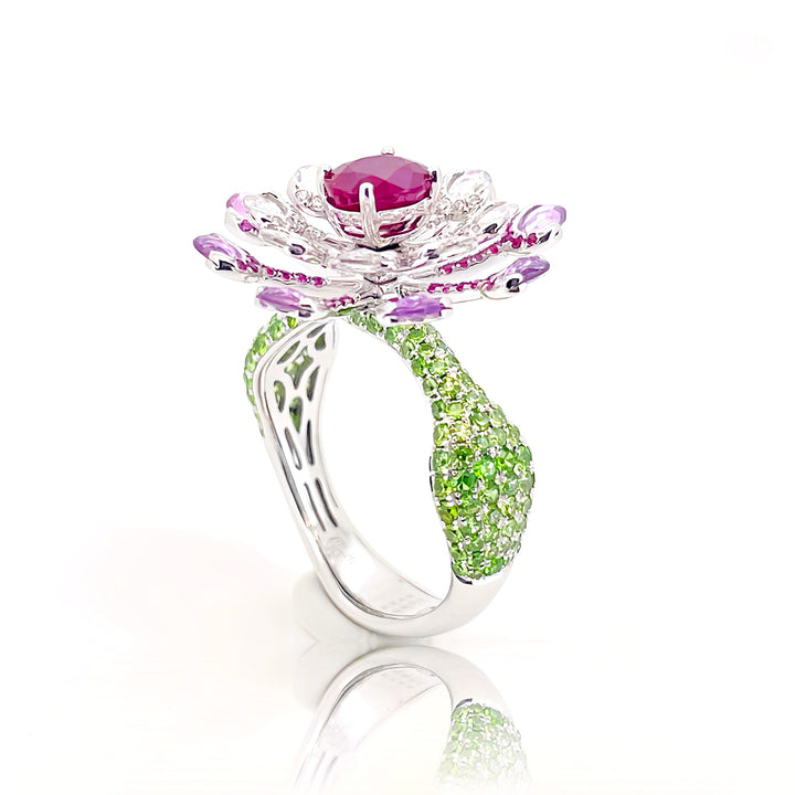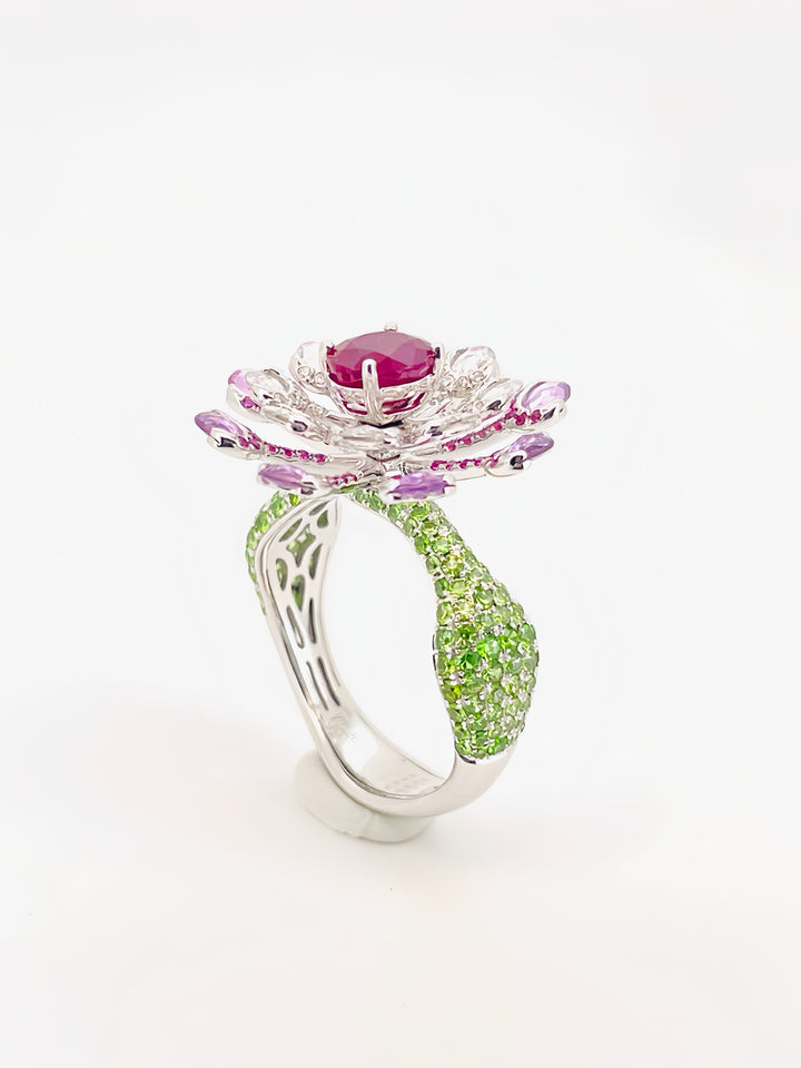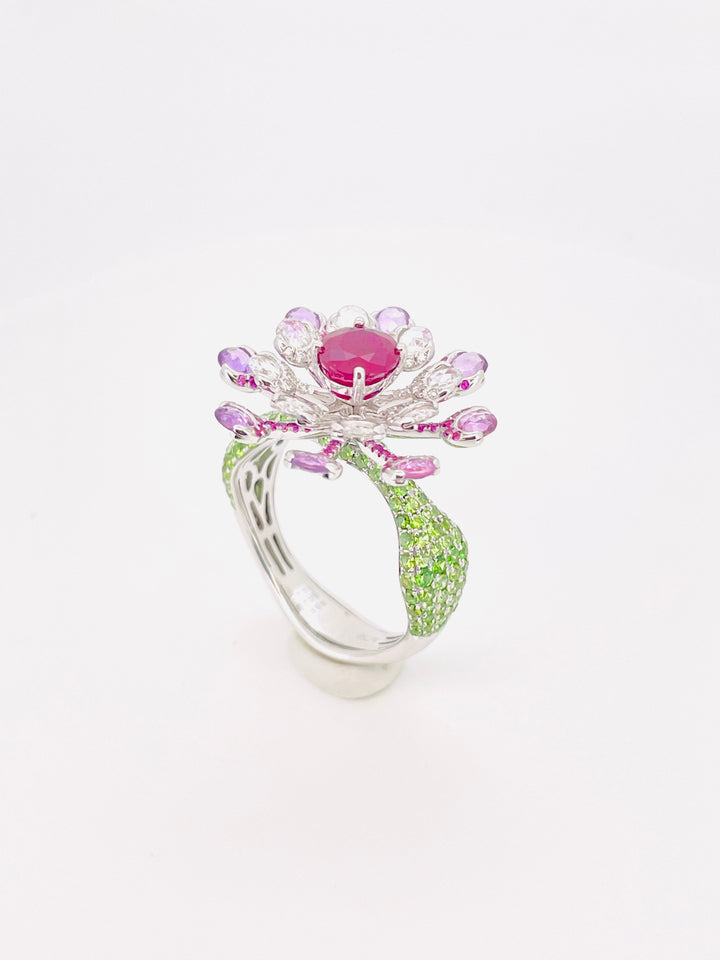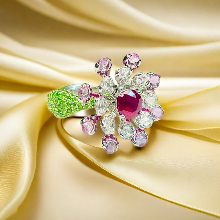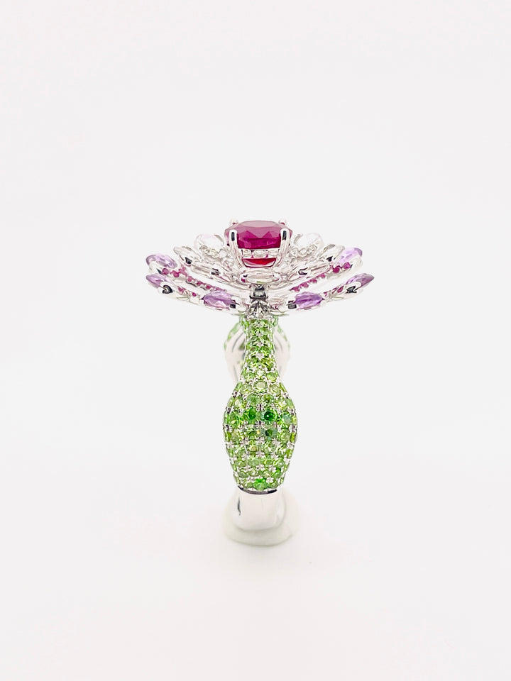 Captivate with the floral elegance of this breath-taking ring, showcasing a 1.05ct unheated Burmese ruby at its heart. With an eye-clean clarity and prestigious pigeon blood color, the ruby forms the center of a flower design, elegantly surrounded by gemstone petals. Shimmering side diamonds (0.37ct), vivid Ural demantoid (0.83ct), and pink sapphire (0.95ct) create a lush garden of sparkle. Each gemstone petal adds depth and character to the piece, making it a true collector’s idol. Certified by AIGS, this ring perfectly fuses artistry with natural beauty, ideal for jewel enthusiasts and collectors who appreciate botanic-inspired treasures.
