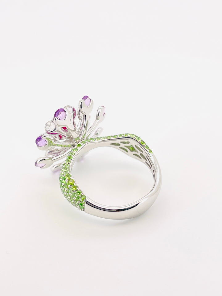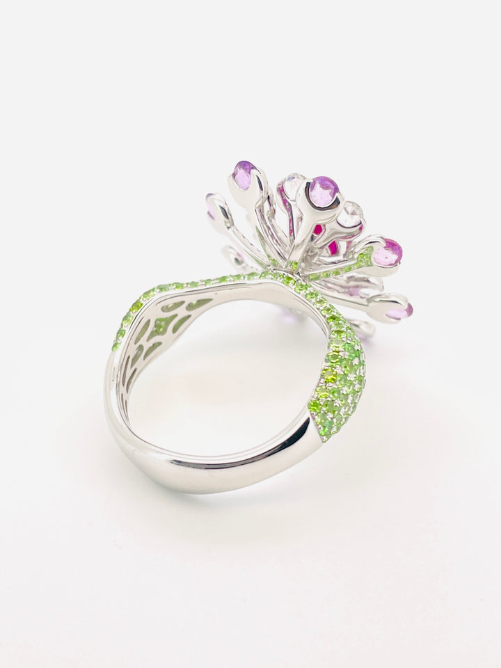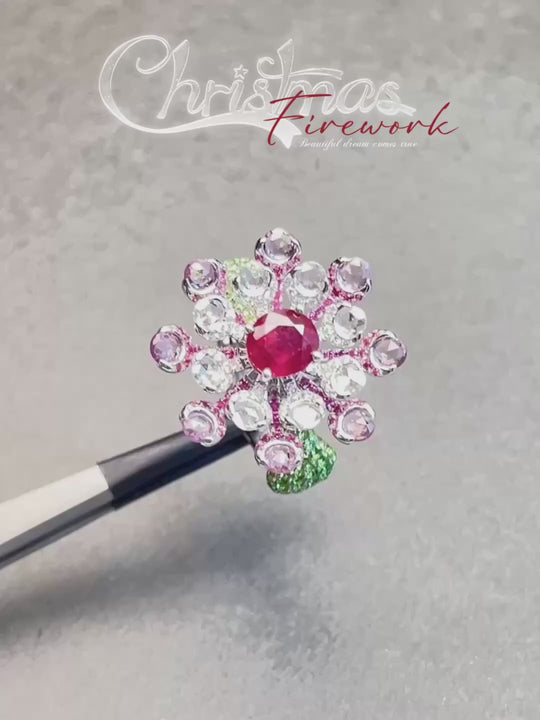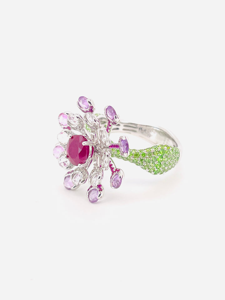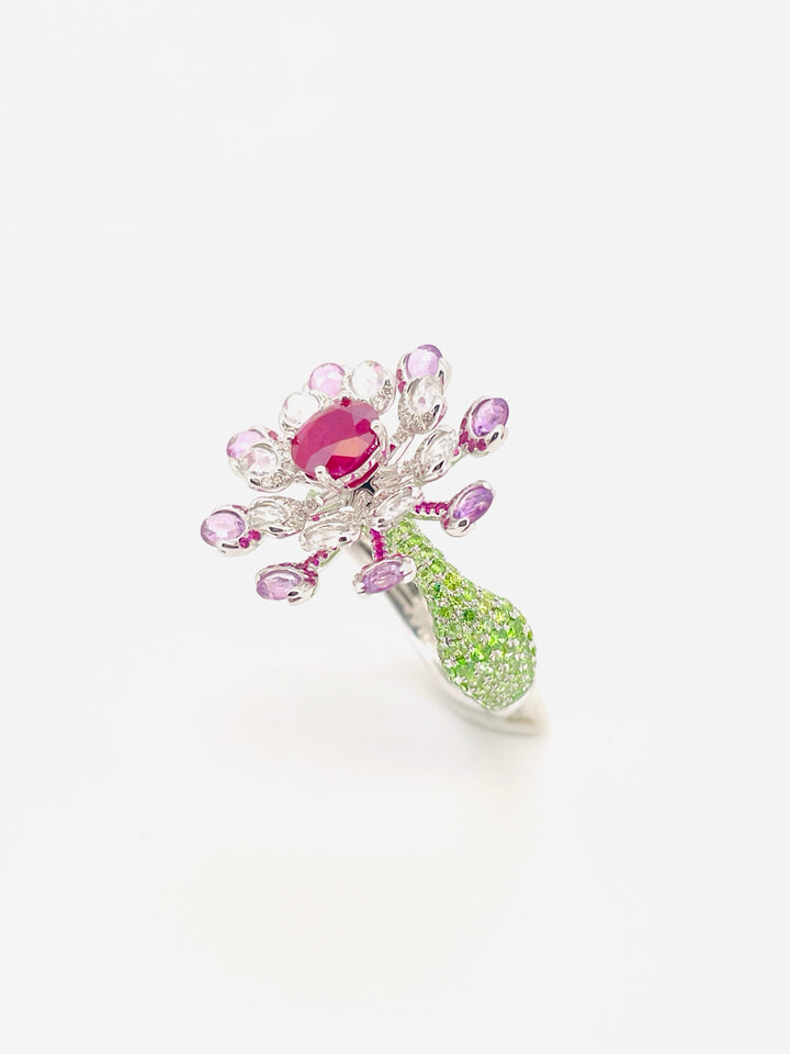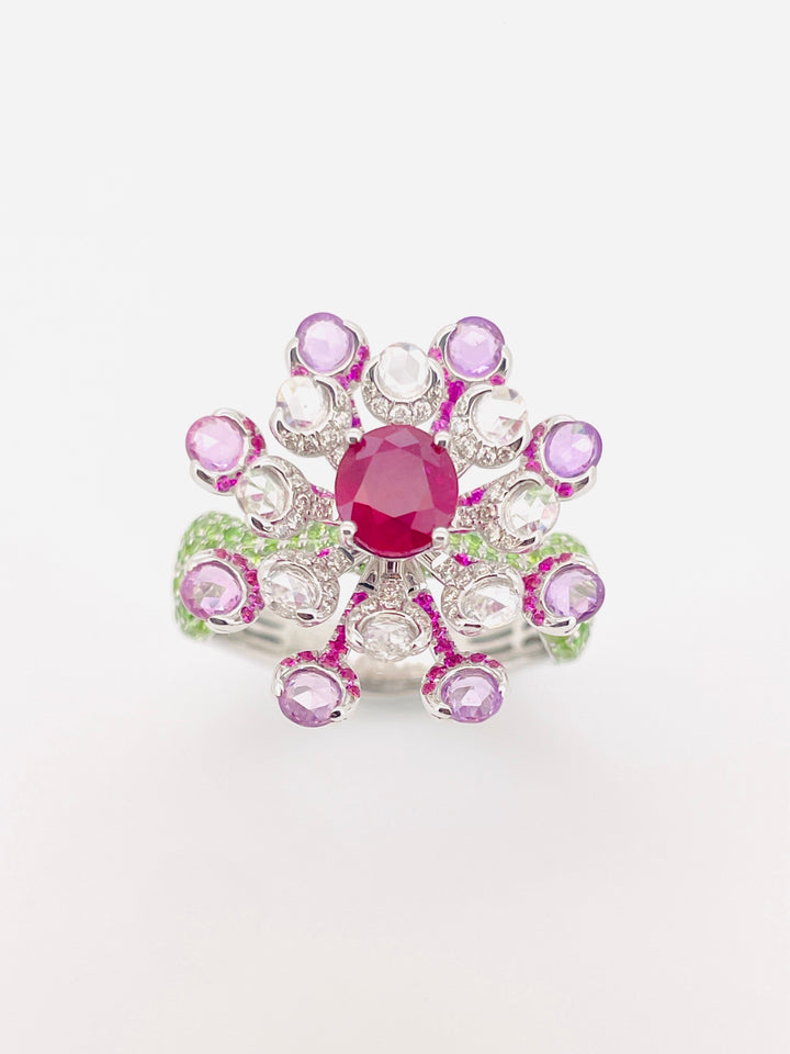 Captivate with the floral elegance of this breath-taking ring, showcasing a 1.05ct unheated Burmese ruby at its heart. With an eye-clean clarity and prestigious pigeon blood color, the ruby forms the center of a flower design, elegantly surrounded by gemstone petals. Shimmering side diamonds (0.37ct), vivid Ural demantoid (0.83ct), and pink sapphire (0.95ct) create a lush garden of sparkle. Each gemstone petal adds depth and character to the piece, making it a true collector’s idol. Certified by AIGS, this ring perfectly fuses artistry with natural beauty, ideal for jewel enthusiasts and collectors who appreciate botanic-inspired treasures.