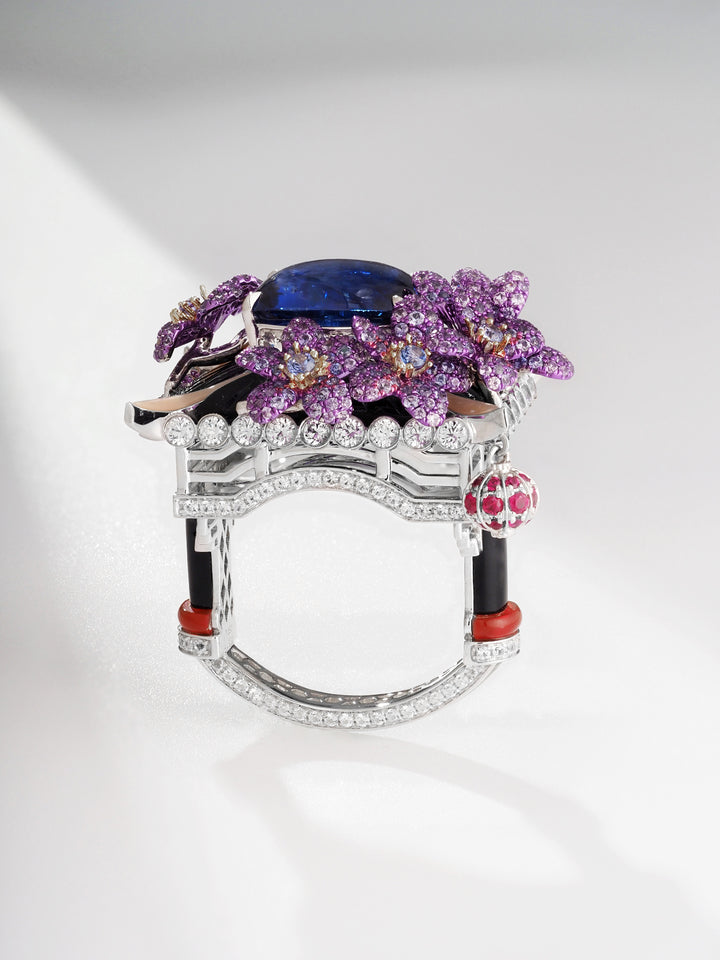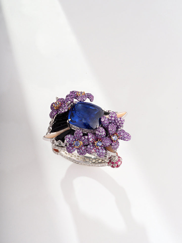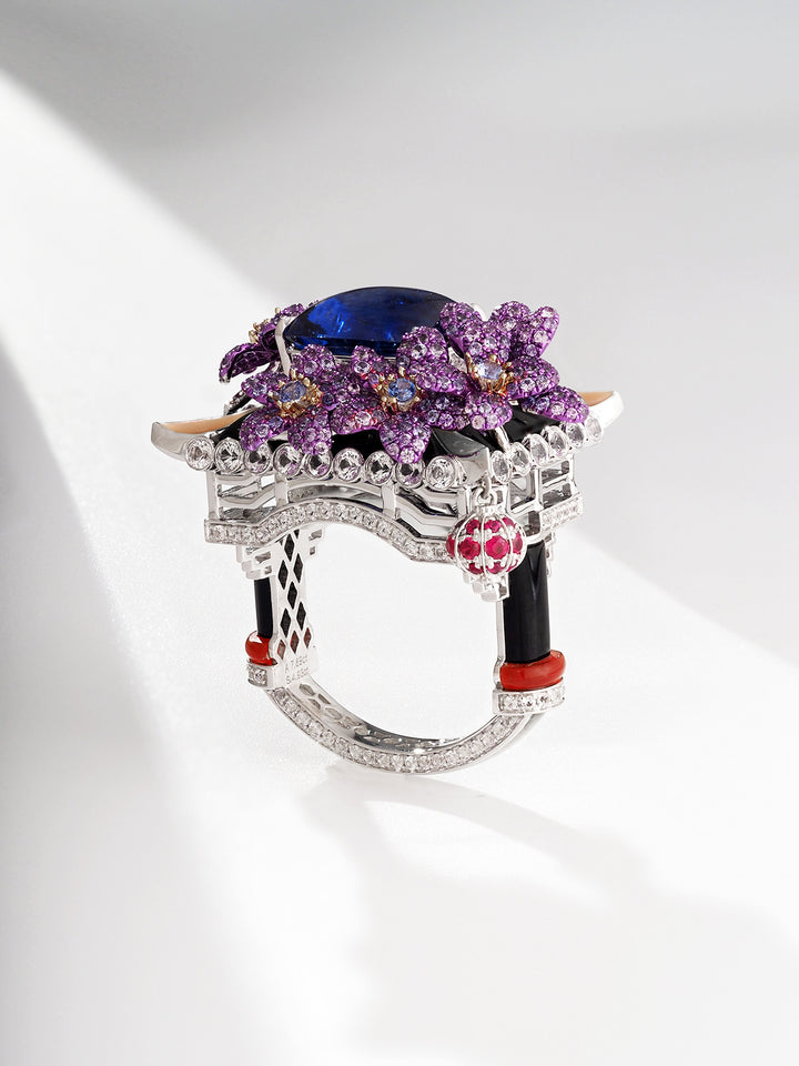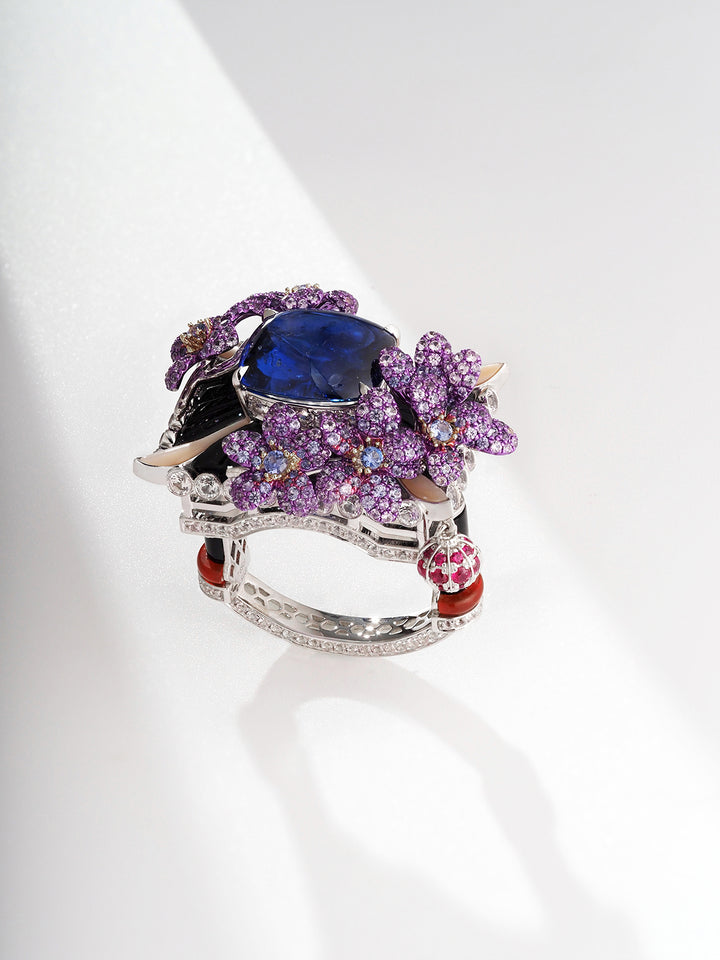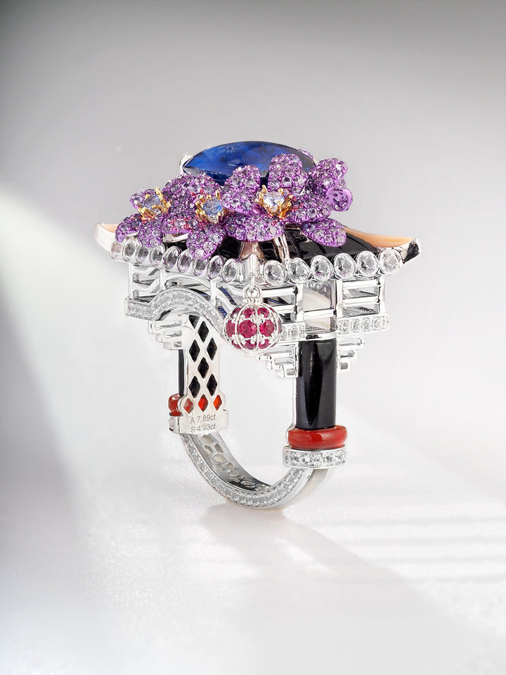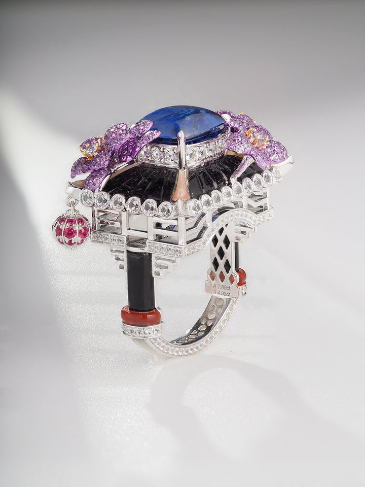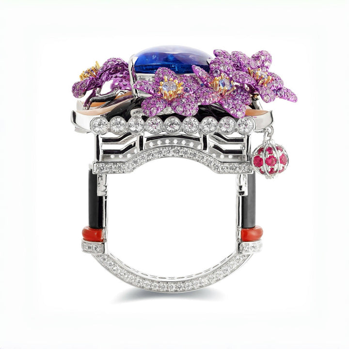 Embrace opulence with this extraordinary Royal Blue Sapphire Ring, elegantly crafted in 18K gold. The centrepiece is an exceptional 7.89 ct royal blue sapphire, beautifully complemented by 438 side stones totalling 4.70 ct. Intricate floral details, adorned with sparkling sapphires and set against a backdrop of black agate accents totalling 8.26 carats, create a vibrant and artistic design. The total gemstone weight reaches 20.85 carats, making this ring a true statement piece. With a comfortable fit at size 14#HK/7# USA/54 Europe, you can experience the pinnacle of luxury jewelry craftsmanship with this exquisite creation.