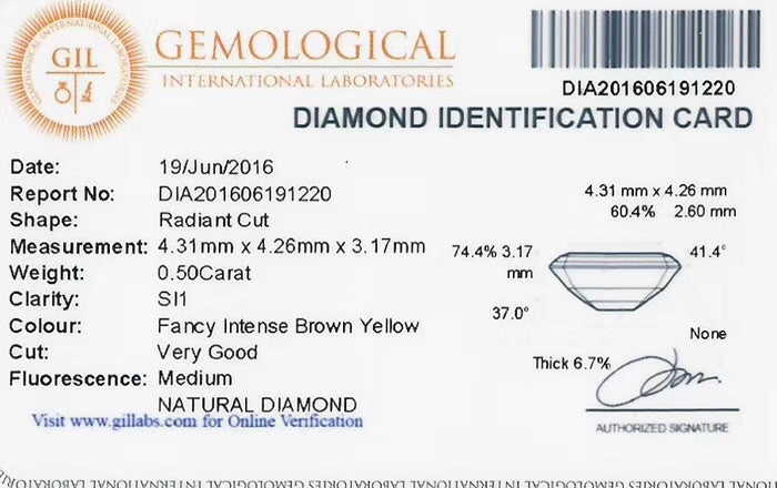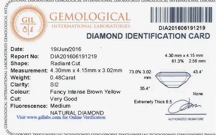 Discover the exquisite allure of this matched pair of Fancy Intense Brown Yellow Diamonds, ideal for creating elegant and unique jewelry pieces. These diamonds feature a captivating Radiant Cut, known for its ability to enhance color brilliance and sparkle. One diamond weighs 0.48 carats with SI2 clarity, and the other is slightly larger at 0.50 carats with SI1 clarity, offering a harmonious yet distinct visual appeal. Both diamonds exhibit medium fluorescence and are verified by Gemological International Laboratories (GIL), ensuring authenticity and quality. Perfect for collectors or as a striking addition to a custom design