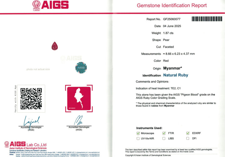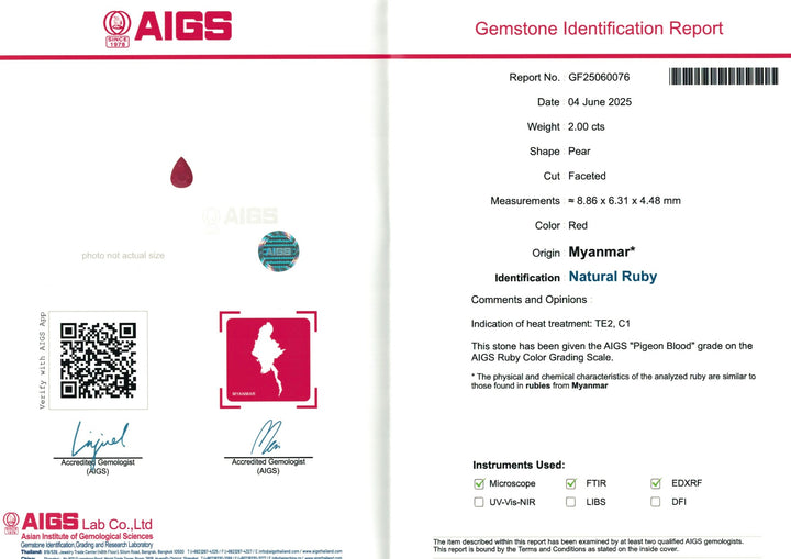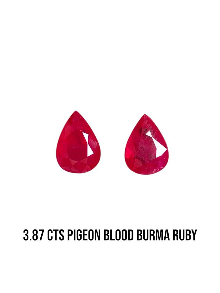 Introducing an exquisite pair of natural Burmese rubies, certified by AIGS for their exceptional quality. With a total weight of 3.87 carats, these rubies exhibit the breathtaking pigeon blood color that is highly prized among gemstone enthusiasts. The pair is distinguished by its eye-clean clarity and excellent cut, showcasing the mesmerizing beauty and intense color that make Burmese rubies coveted worldwide. Enhanced by heating, these gems offer unparalleled brilliance and durability, ideal for crafting bespoke jewelry or adding to a high-end collection. Experience the epitome of luxury with these certified treasures from Burma.