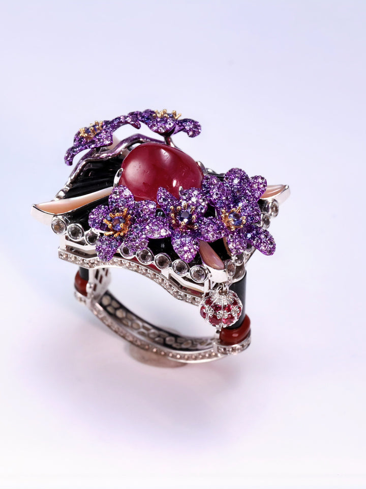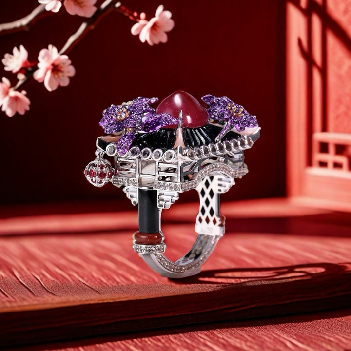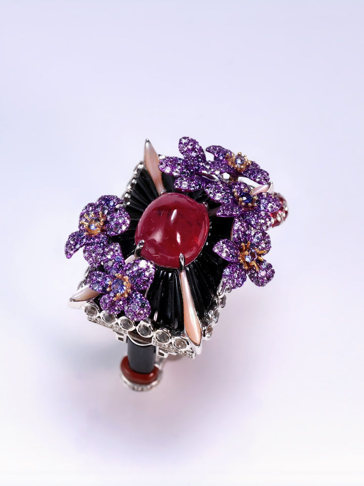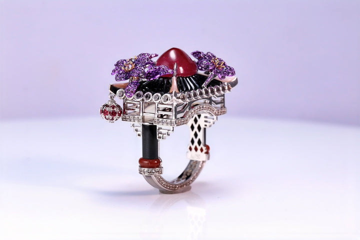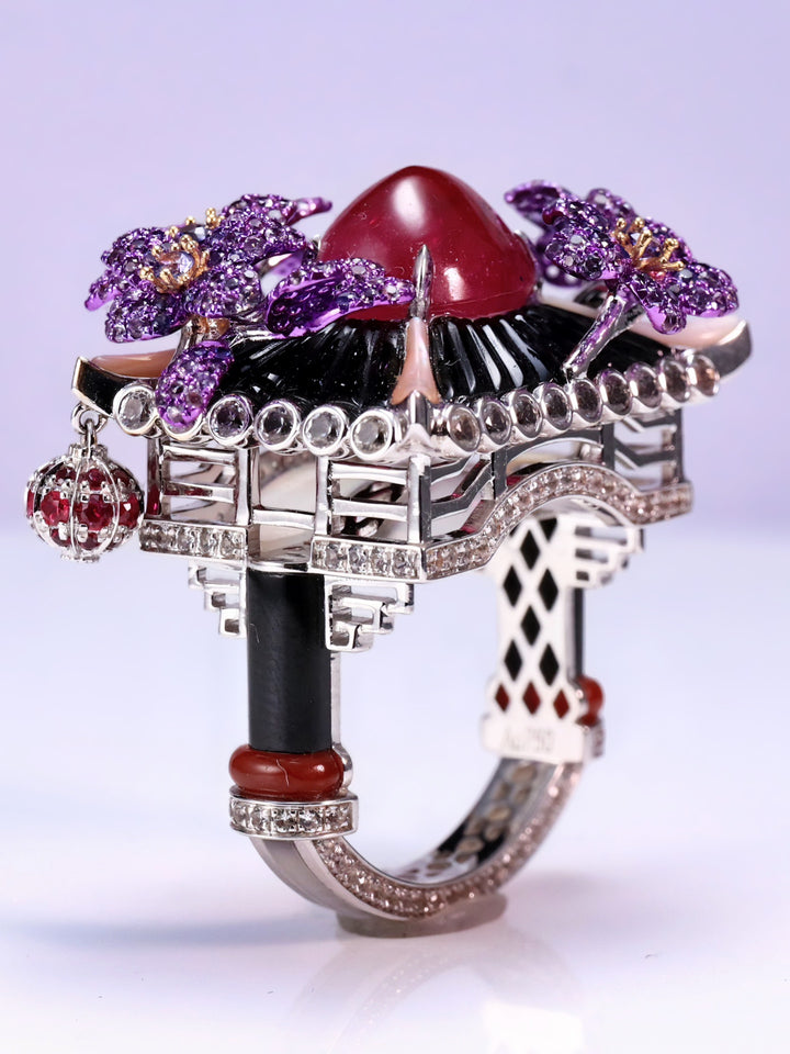 • This ring features an intricate pavilion-inspired design, showcasing a stunning 6.67 ct ruby as its centerpiece. Surrounding the ruby are delicate floral motifs adorned with purple sapphires and yellow diamonds, creating a vibrantand elegant contrast. The architectural elements of the band are embellished with brilliant-cut diamonds, black enamel, and red coral details, adding depth and sophistication.The combination of gemstones, enamel, and intricatemetalwork reflects a fusion of art and craftsmanship. making this ring a statement piece.