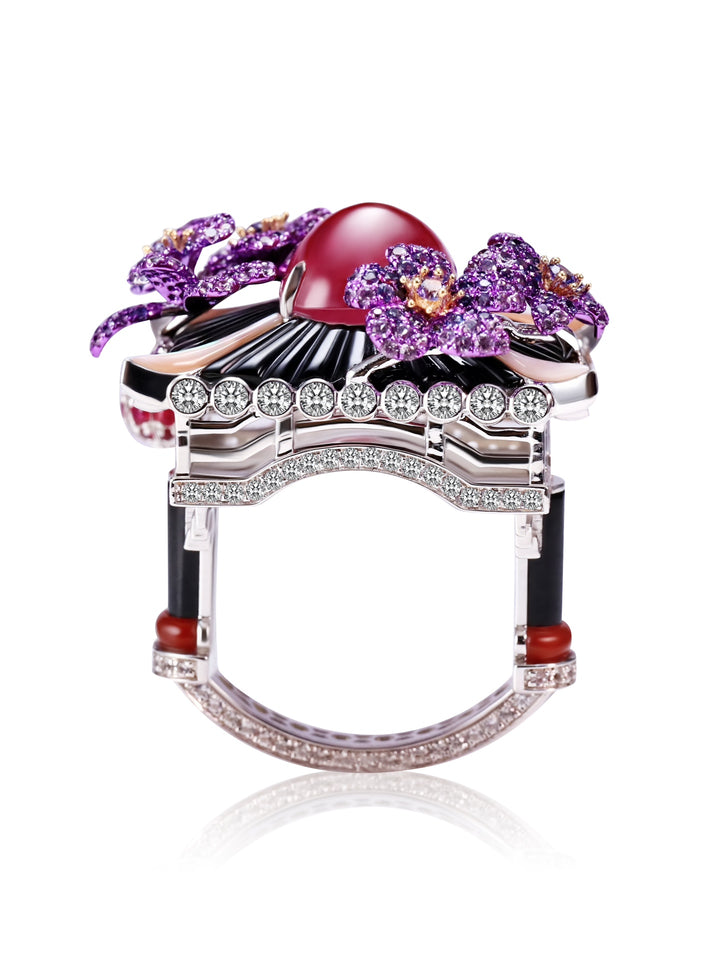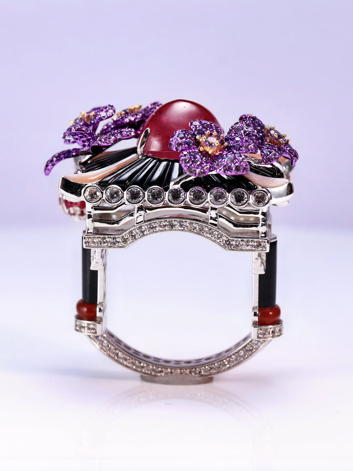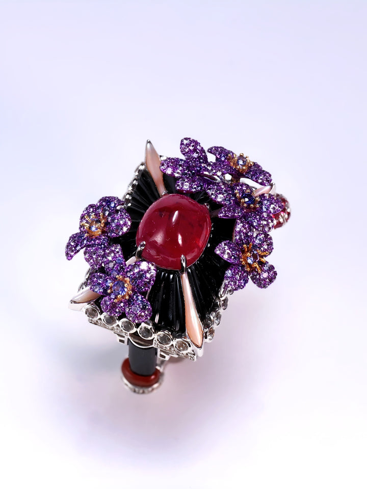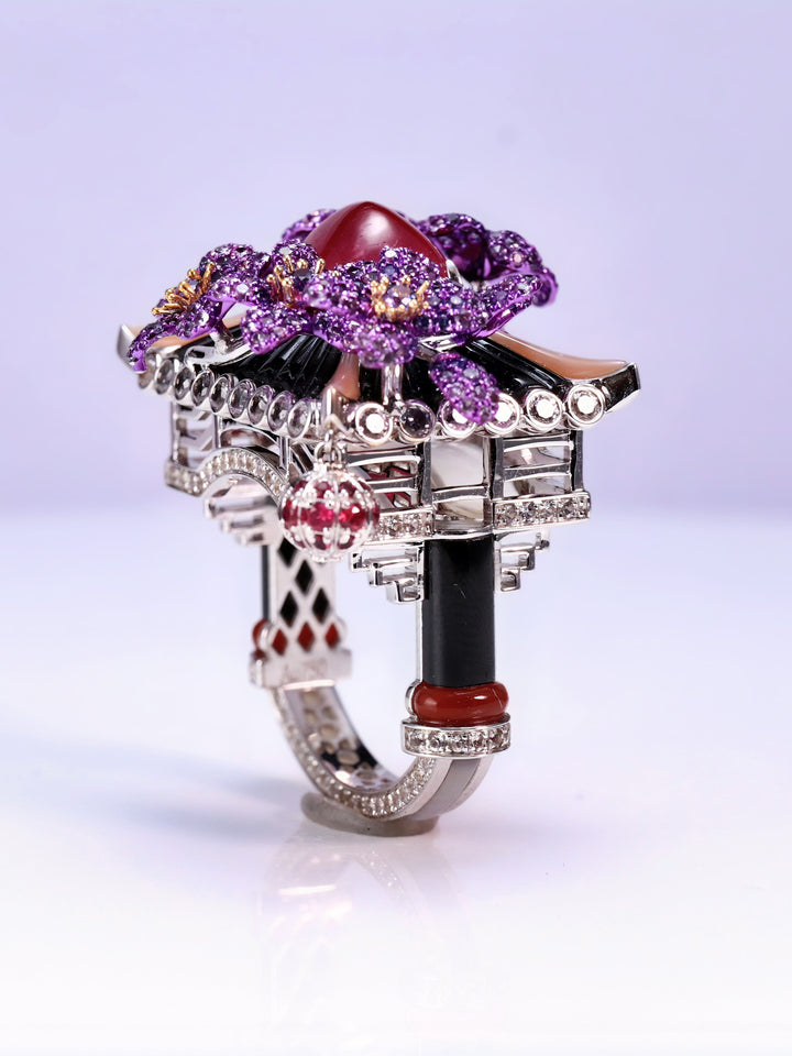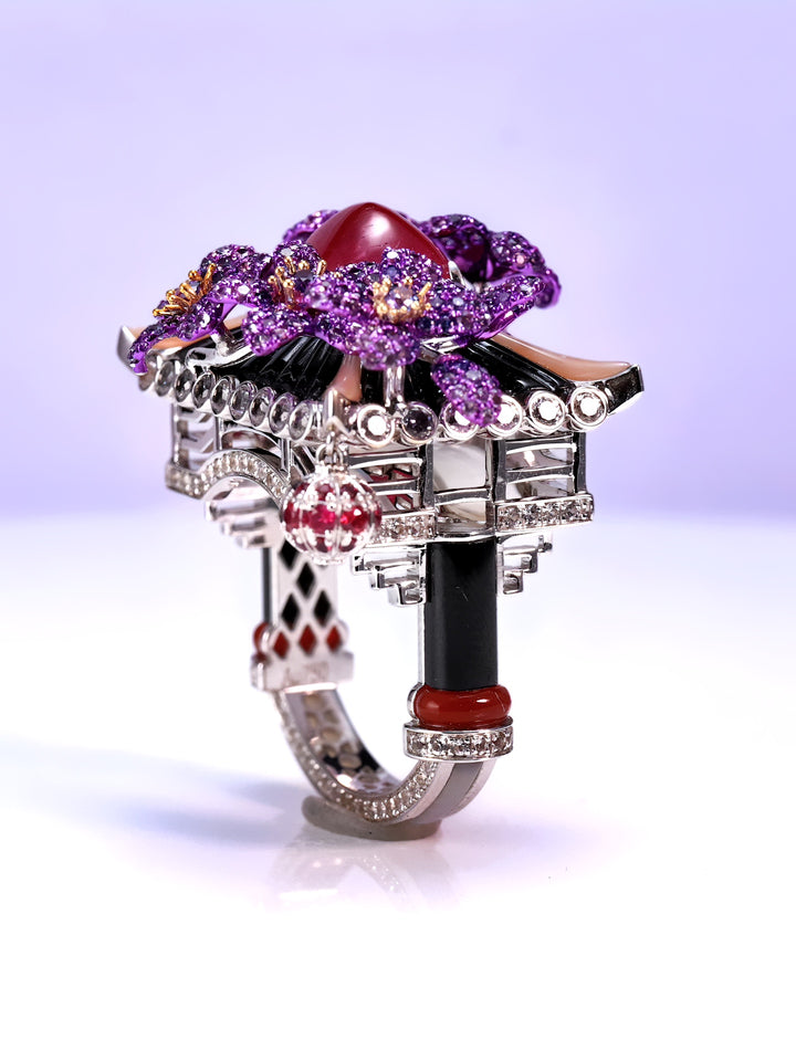 • This ring features an intricate pavilion-inspired design, showcasing a stunning 6.67 ct ruby as its centerpiece. Surrounding the ruby are delicate floral motifs adorned with purple sapphires and yellow diamonds, creating a vibrantand elegant contrast. The architectural elements of the band are embellished with brilliant-cut diamonds, black enamel, and red coral details, adding depth and sophistication.The combination of gemstones, enamel, and intricatemetalwork reflects a fusion of art and craftsmanship. making this ring a statement piece.