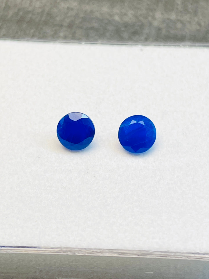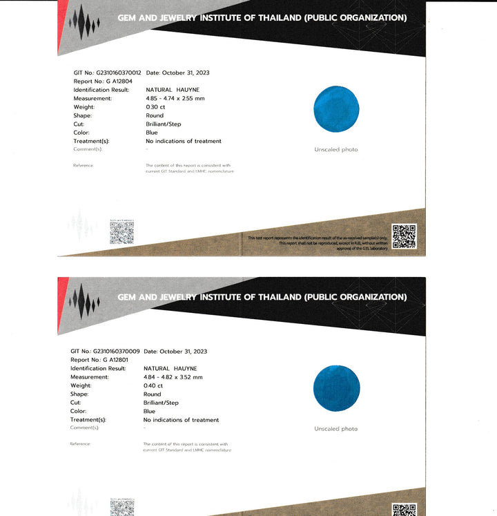 Update your jewelry collection with this exquisite pair of Hauyne gemstones, totaling 0.72 carats, originating from Afghanistan. Known for their striking deep blue hue, these gems capture the eye with 99% and 98% clarity, ensuring nearly flawless transparency. Their standard cut showcases the beauty and brilliance of the stones, perfect for creating distinctive and luxurious jewelry pieces. Accompanied by certification from the Thai National Official Laboratory (GIT), these Hauyne gems assure authenticity and quality. Whether for collectors or designers, these gemstones provide a captivating element of rare beauty for any bespoke creation.