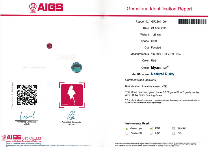 AIGS Certified 1.25ct Unheated Burma Ruby - Pigeon Blood Color Gemstone