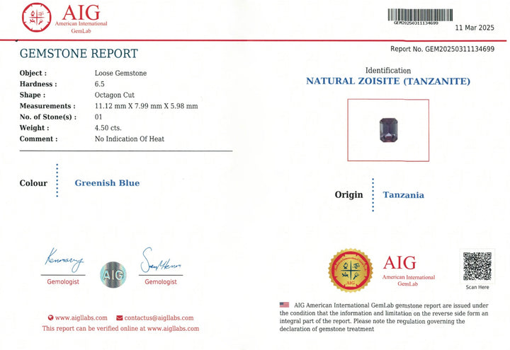 Introducing an exceptional 4.50-carat natural Zoisite, showcasing a captivating greenish-blue color that makes it truly unique. Recognized as a top-quality Tanzanite, this gemstone boasts an elegant octagon cut that enhances its natural brilliance and allure. Originating from the renowned gemstone deposits of Tanzania, this Zoisite is authenticated by The American International GemLab (AIG) and certified to have no indication of heat treatment, preserving its natural state and beauty. Perfect for gemstone collectors and bespoke jewelry creations, this gemstone is a rare find that blends vibrant hues with exquisite craftsmanship.