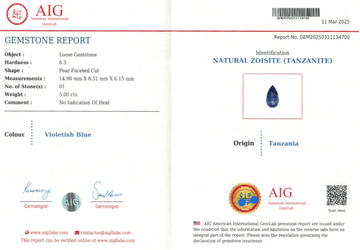 Explore the captivating allure of this 5.00-carat natural Tanzanite gemstone, celebrated for its enchanting violethish blue color. Mined from the prestigious regions of Tanzania, this Tanzanite is beautifully crafted into a pear faceted cut, enhancing its brilliance and colorful play. Certified by the American International GemLab (AIG), this gemstone is authenticated as having no indications of heat treatment, maintaining its natural and pure beauty. Perfect for sophisticated jewelry pieces or as a treasured addition to gemstone collections, this Tanzanite embodies elegance and exquisite craftsmanship.
