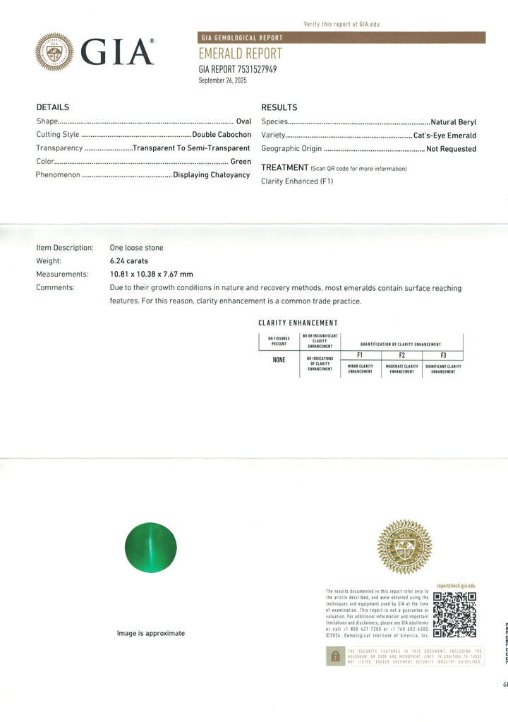 Introducing the magnificent 6.24 carat Natural Emerald Cat's Eye, an epitome of rarity and allure. This exceptional gemstone boasts a vibrant green hue coupled with the fascinating cat's eye effect, also known as chatoyancy. With its excellent cut, the stone radiates an impressive brilliance, further accentuated by eye-clean to VVS clarity. Enhanced with minor oil treatment, the gemstone's natural beauty is carefully preserved. Certified by GIA, this Emerald Cat's Eye is a truly unique acquisition for gemstone enthusiasts and collectors, emphasizing both authenticity and unparalleled elegance.